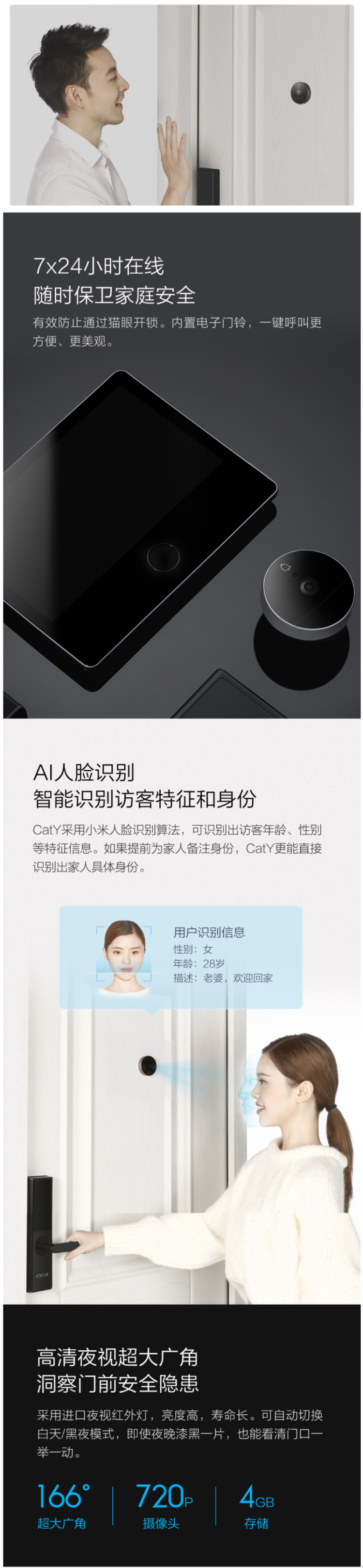 这款鹿客 Cat 智能夜视电子猫眼,拥有强大的人脸识别功能,借助人工智能算法,对访客进行人脸识别,陌生人可以识别出年龄、性别、穿戴等信息,已经备注过的家人可以识别出具体身份,非常牛逼了,感觉跟电影里展现的一模一样了。
