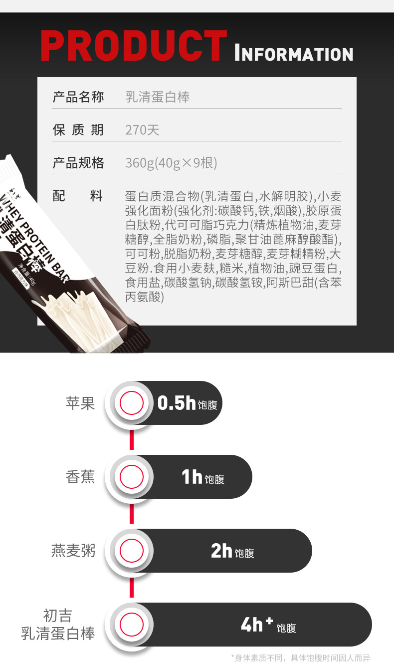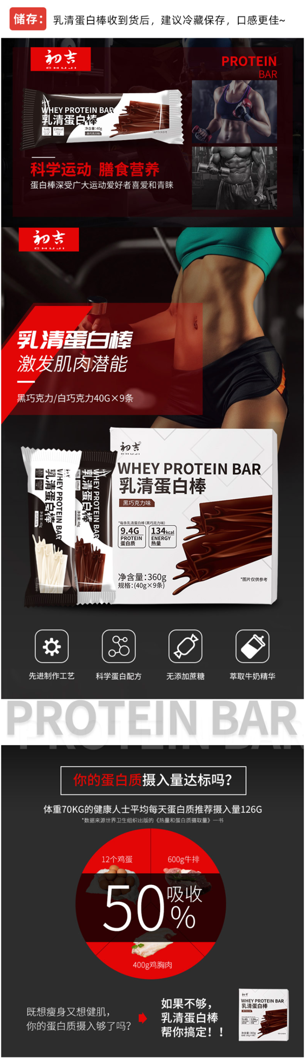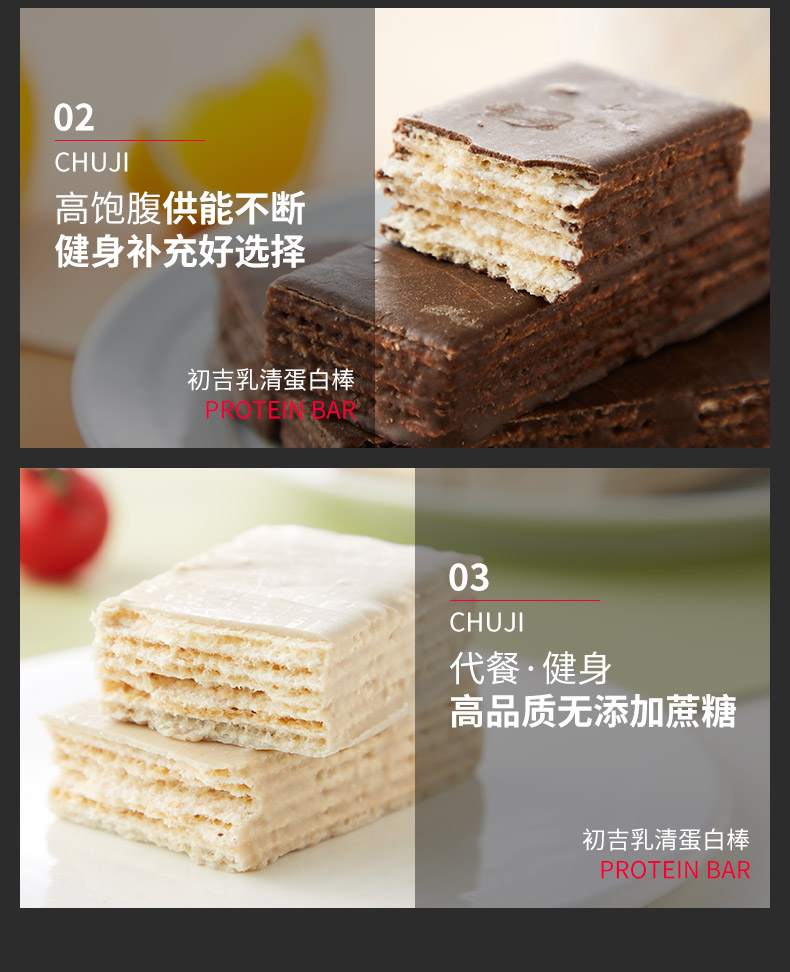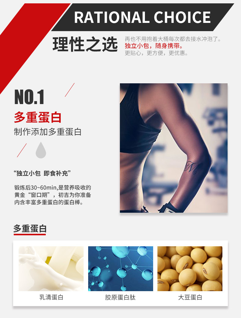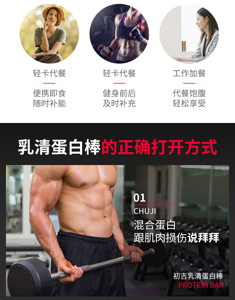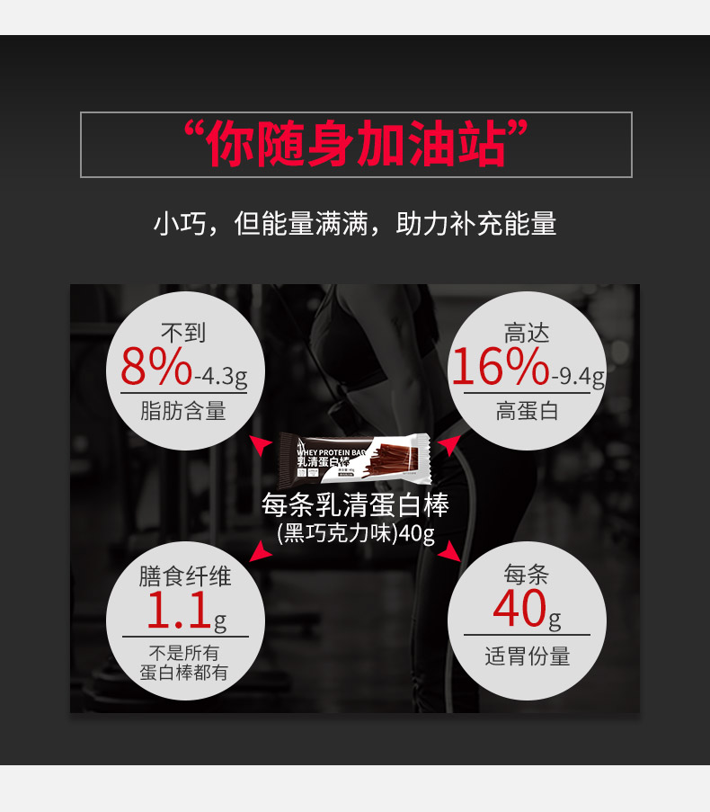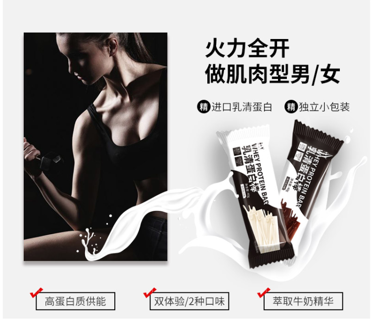 采用新西兰进口乳清蛋白,胶原蛋白肽、大豆蛋白多重科学蛋白配方,无添加蔗糖。萃取牛奶精华,每条能量棒40g,蛋白质占16%、膳食纤维1.1g、脂肪含量不到8%,0反式脂肪,轻卡代餐,激发肌肉潜能。适合锻炼后30-60分钟补充能量。独立小袋包装,方便携带。