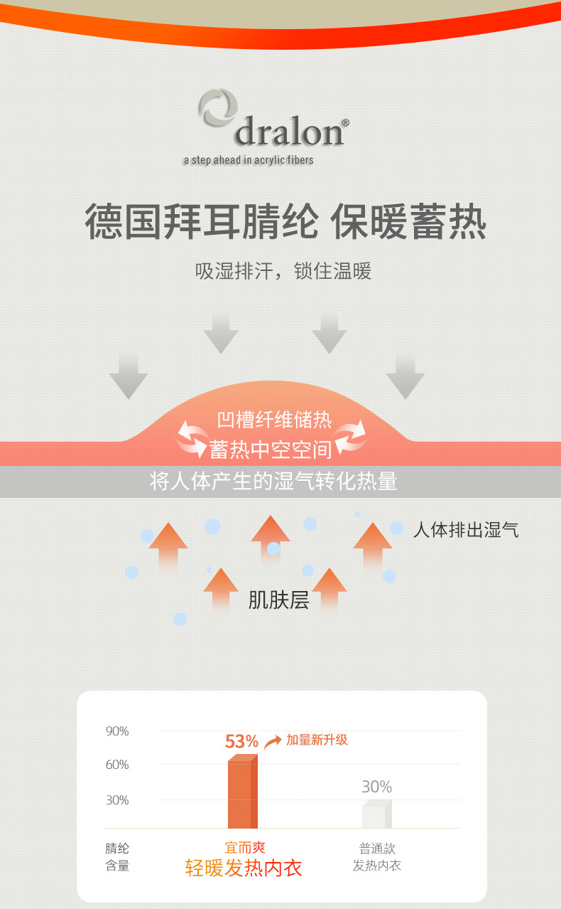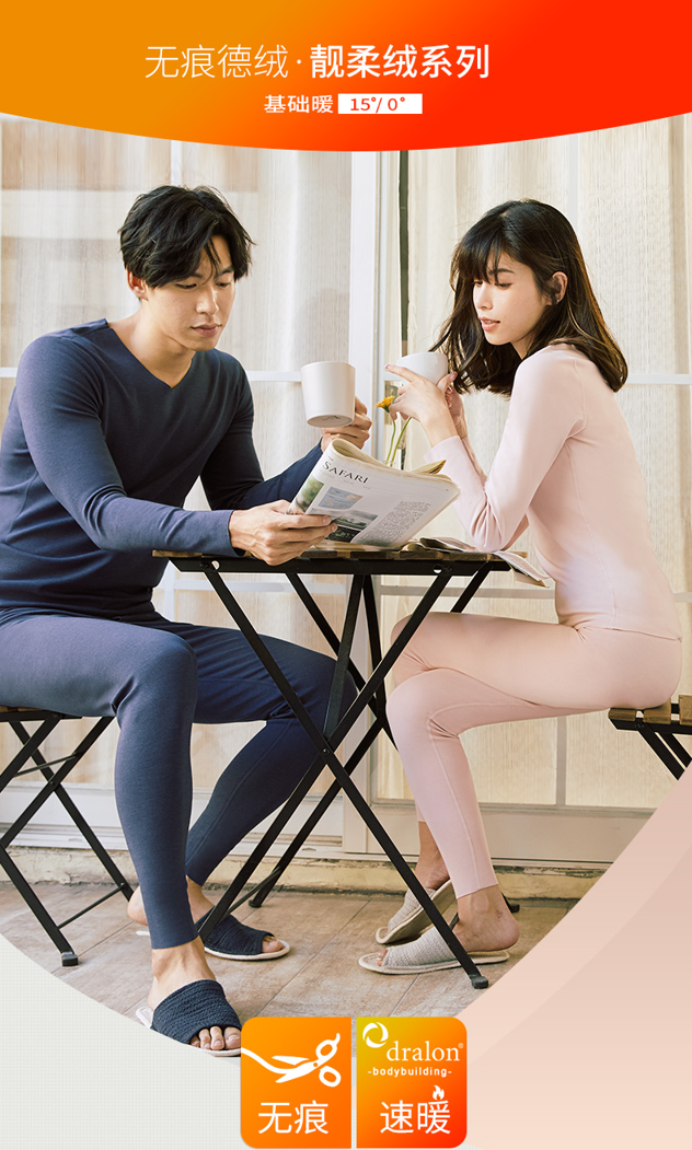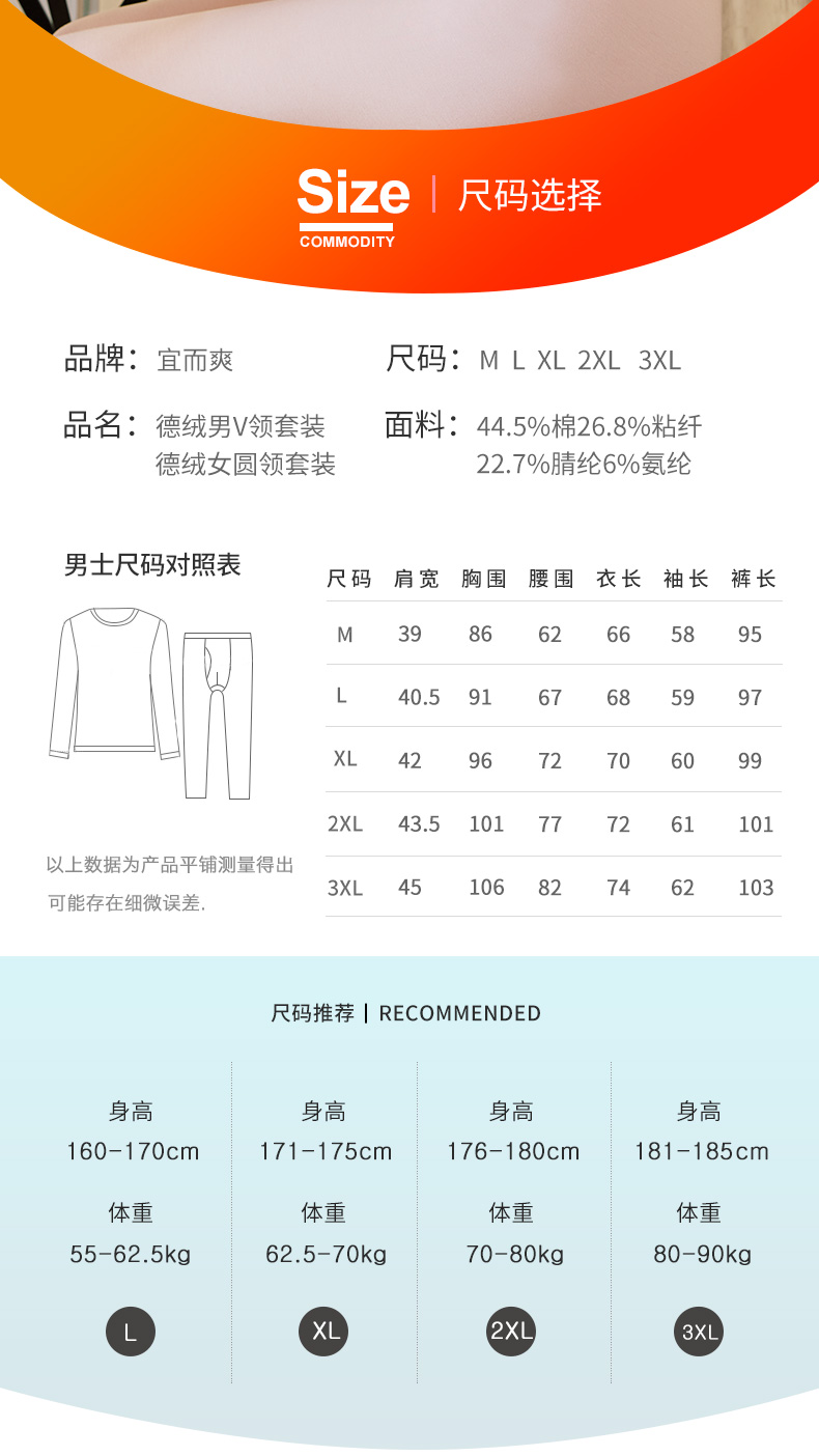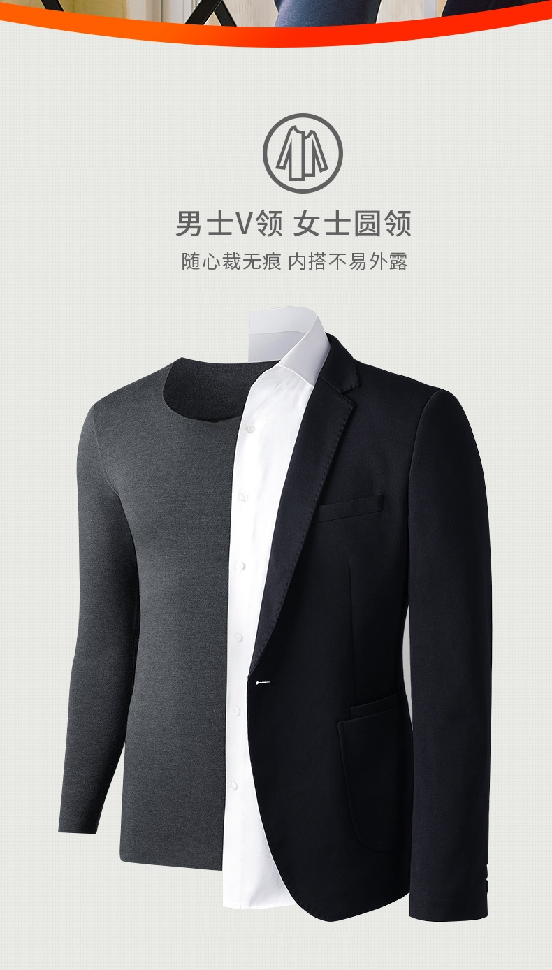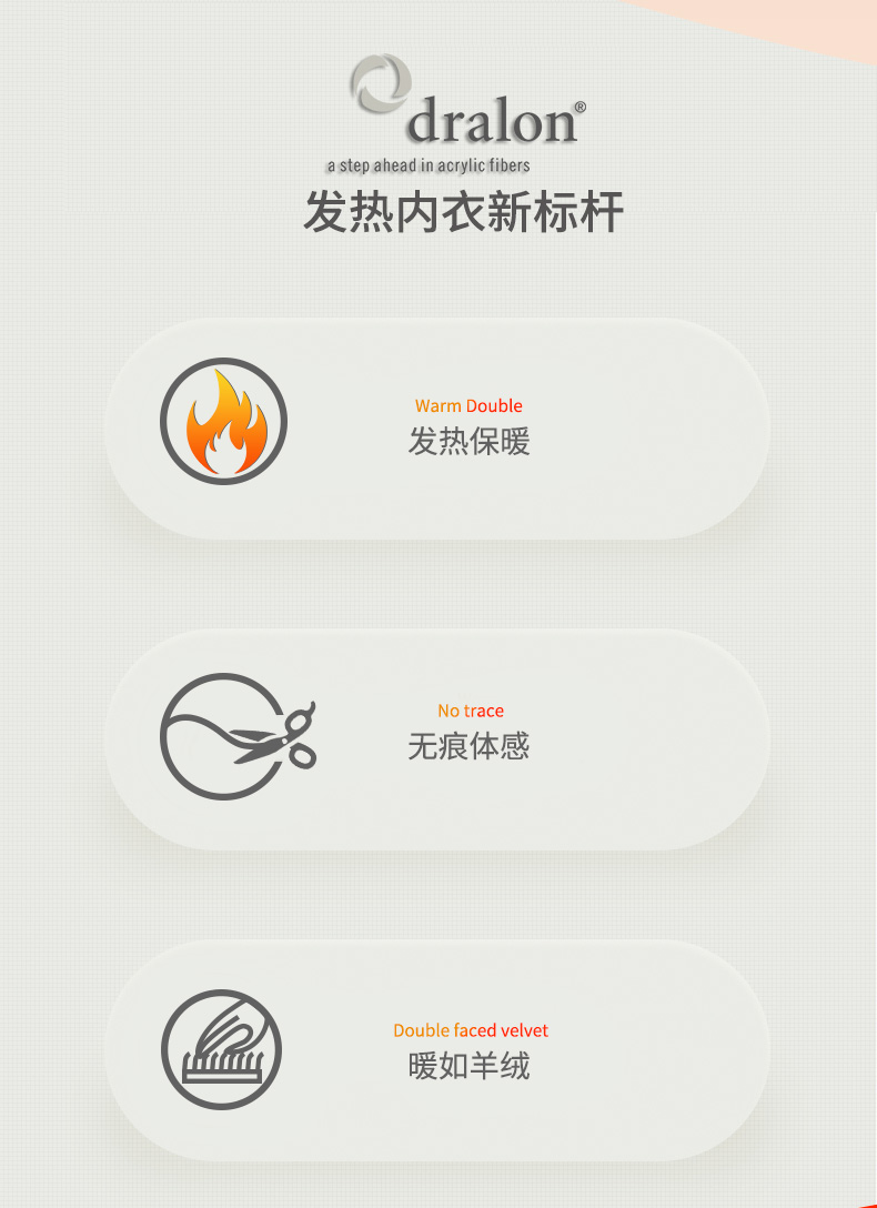 这款宜而爽保暖秋衣采用磨毛德绒面料,透气保暖性好,混入氨纶纤维提高弹性,没有紧绷感,穿着亲肤舒适。修身版型,内搭不易露出。内外车线公正紧密,四针六线工艺,不易墨仓皮肤,进一步提升舒适性。活性印染工艺,安全健康。