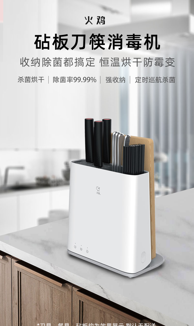 火鸡消毒刀架,通过紫外线和高温双重杀菌,具有2个紫外线光源和双热源,破坏病毒和细菌的生长环境,卫生安全,70℃的热风能够快速烘干餐具刀具,外部45℃的柔风养护砧板,放置开裂。