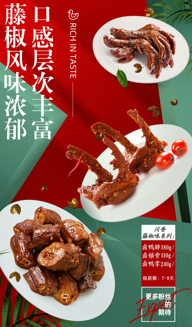 周黑鸭微甜爽辣,入口有点甜,而后越吃越辣,越吃越麻,越吃越香,最后往往一把鼻涕一把泪。“锁鲜装”系列主要是方便保存,在具有气体阻隔性能的包装盒内充入99%的氮气,能有效减缓新鲜食品的变质速度,并且保持口感新鲜。