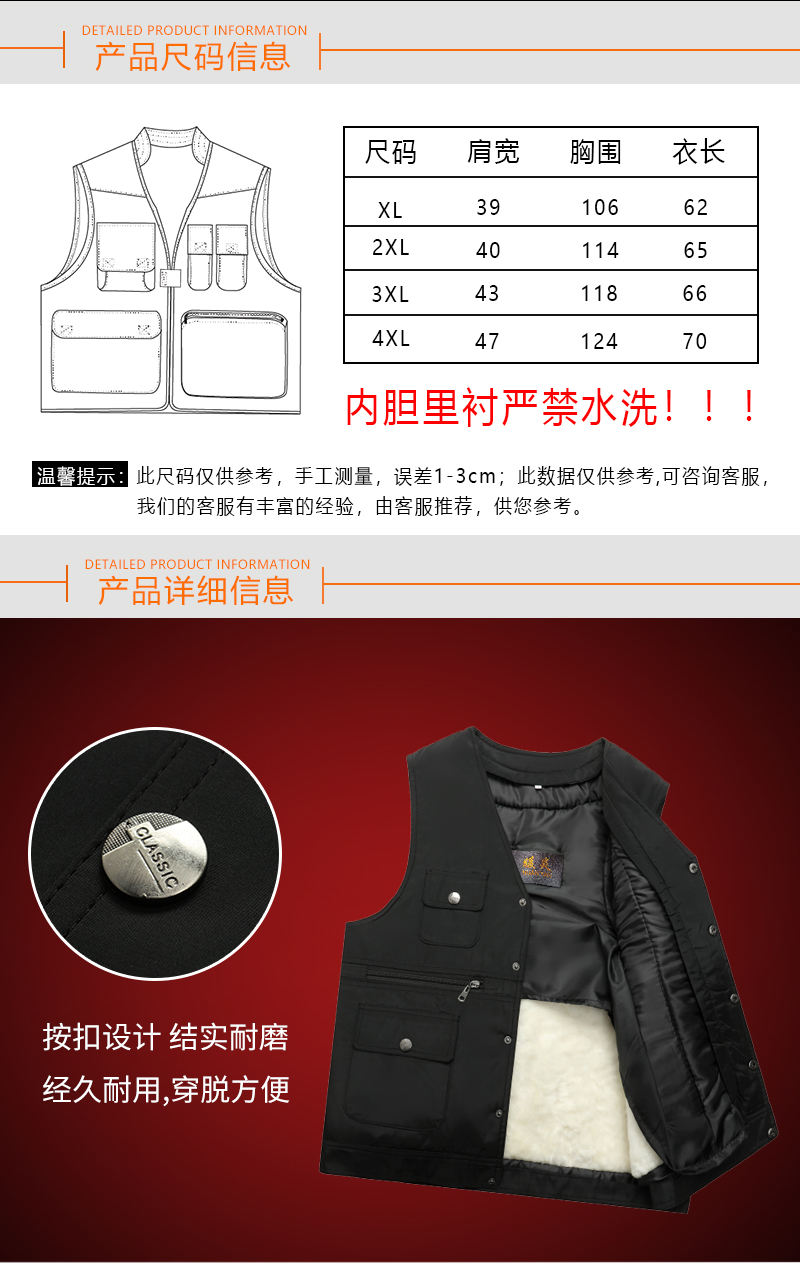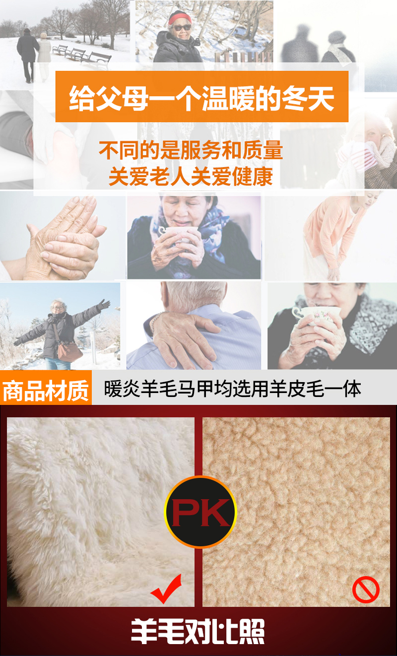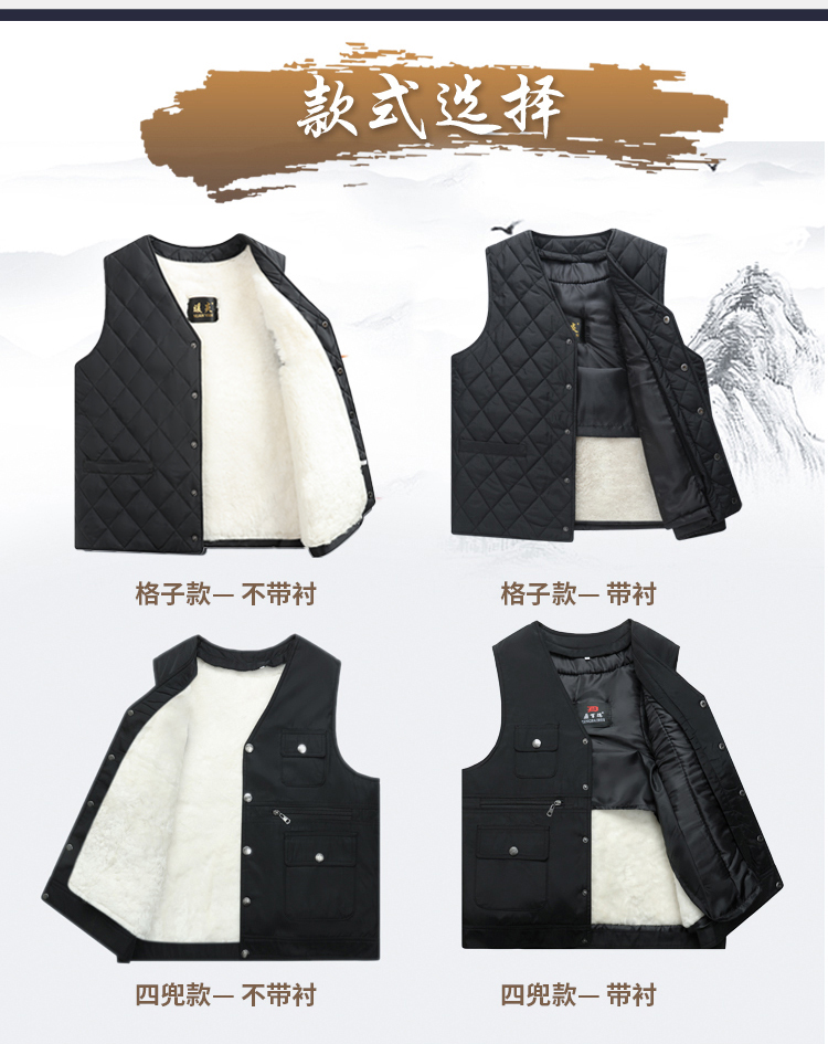 合体版型,基本不挑身材。整体走线工整紧密,不易开线,耐磨耐穿;内里皮毛和外层面料采用拉链连接,方便拆洗。经典马甲款式,可外穿,可内搭,很适合送家中长辈。