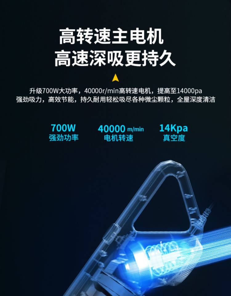 家用小型手持式大吸力吸尘器,轻松除尘,净享无尘空间,家用除尘小能手。强劲吸力,高速清扫,每分钟高达40000转,快速移动清洁,多场景适用,床单沙发都可以用,真正的一机搞定
