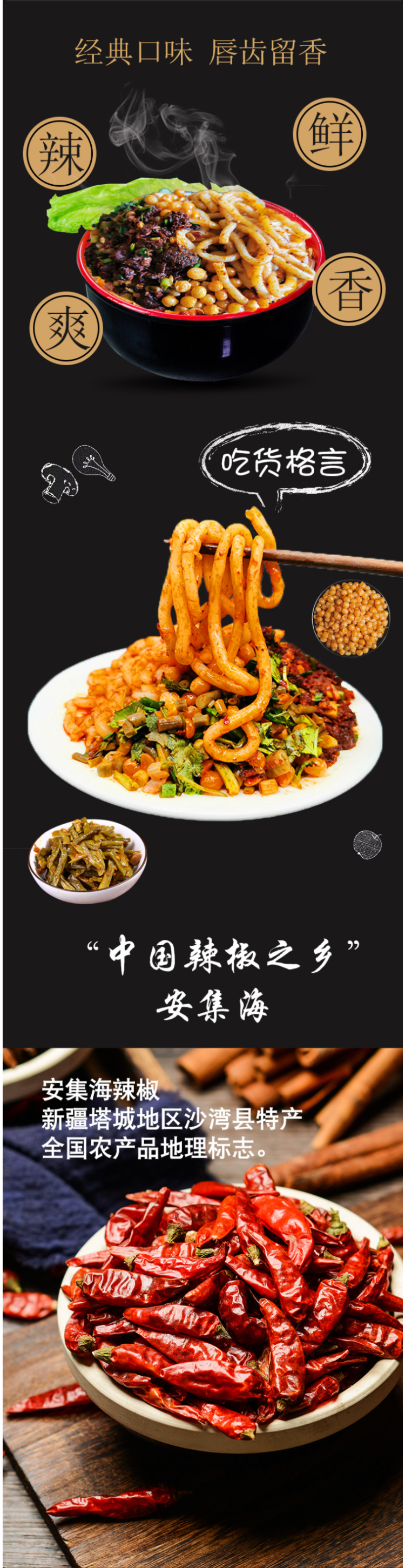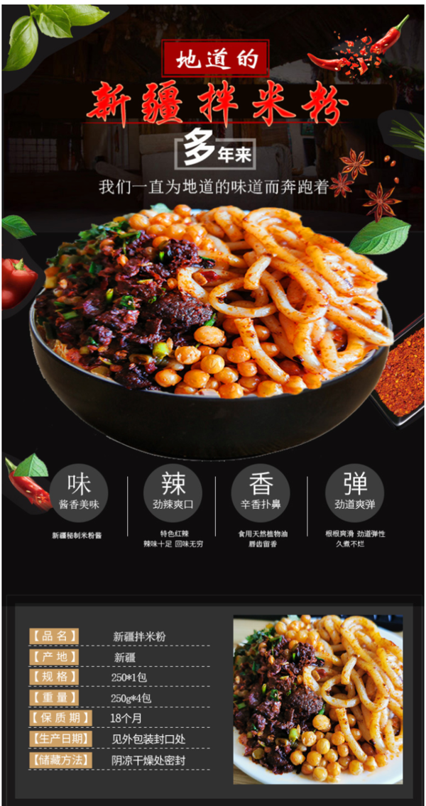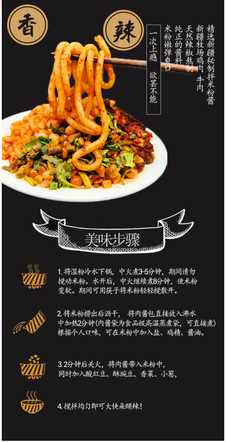 新疆炒米粉是一道新疆本地的名小吃。这款鸡肉/牛肉拌米粉是新疆塔城地区沙县的特色食品,使用较粗有嚼劲的米粉,搭配酸缸豆、黄金豆、安集海辣椒、汤汁配料,颜色浓郁,香辣爽口。