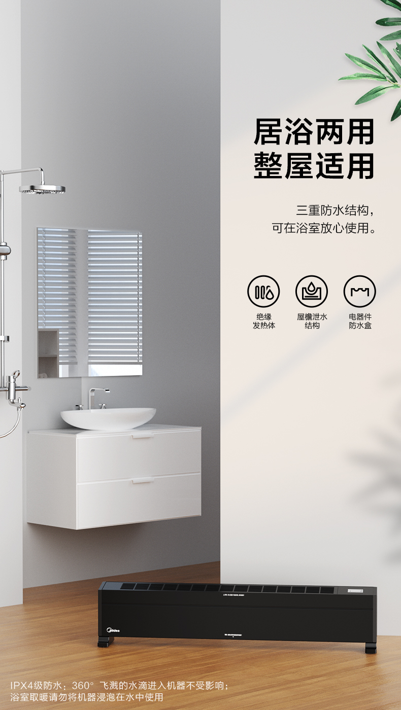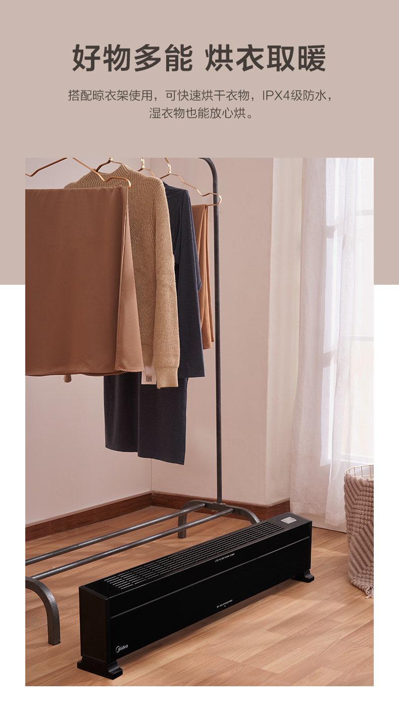 工作时静音低噪,不影响晚上睡眠。整机IPX4级防水,放在衣物下面可作烘干机使用,有1100W和2200W两档可调。