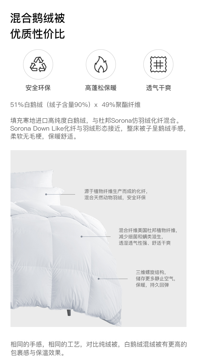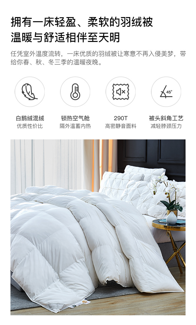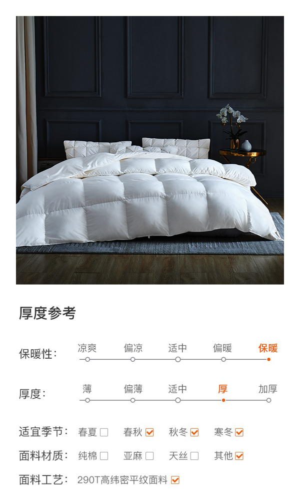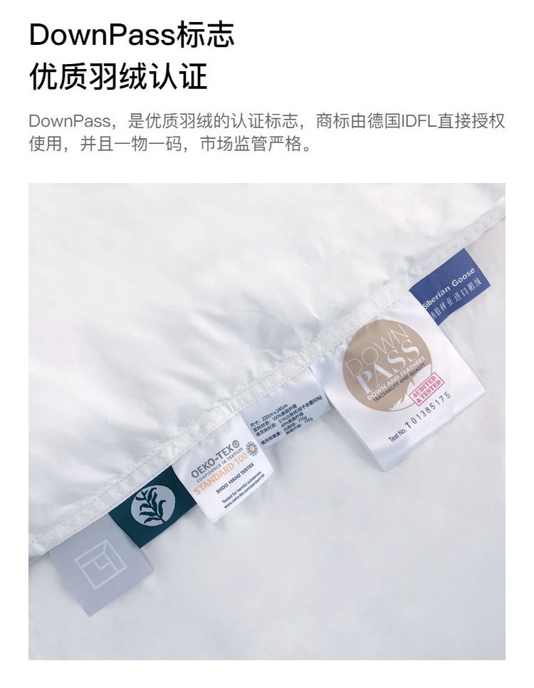 填充西伯利亚进口高纯度白鹅绒,DOWNPASS优质羽绒认证,与杜邦仿羽绒化纤以51:49配比混合,绒子含量90%,仿羽绒化纤与羽绒形态相近。整床被子手感好,保暖舒适。春秋被采用切穿工艺,冬被采用立体内衬。被面为290T高纬密平纹面料,保证透气的同时防止了钻绒现象的产生。