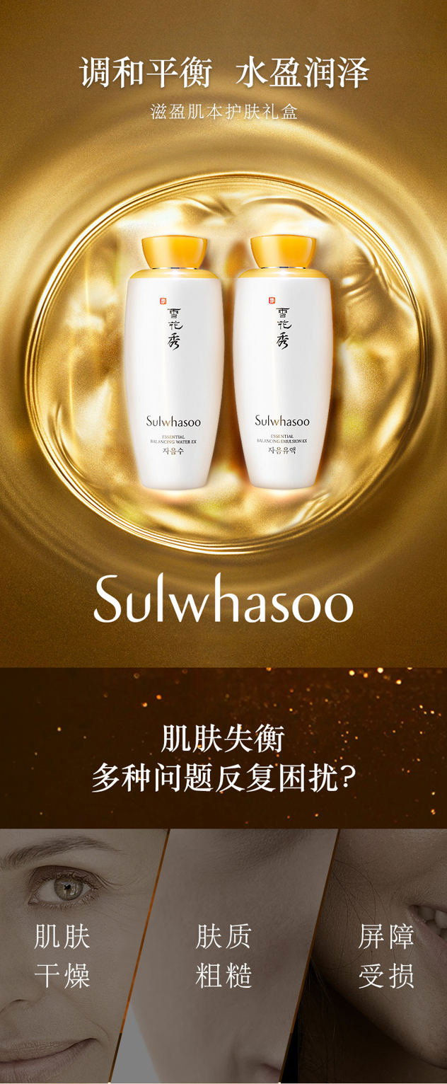 这款雪花秀 乳套装,通过滋阴丹从根本治理因阴气不足而导致的老化现象,由内而外帮助改善肌肤老化,平衡水含马齿苋萃取物供给肌肤水分,缔造饱满水润肌肤,平衡乳含牡丹提取物让肌肤柔滑。早晚使用平衡水后取适量于手中,沿着皮肤纹理轻涂于面部。