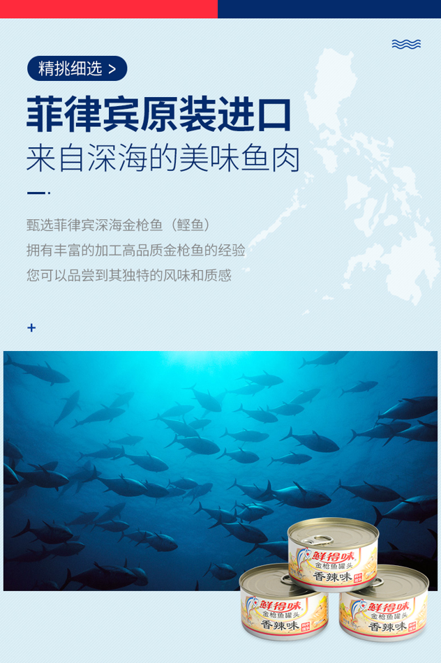 这款鲜得味 香辣口味 金枪鱼罐头,菲律宾原装进口,深海捕捞的天然野生金枪鱼(鲣鱼)的鱼排部位,鱼肉色泽鲜黄,肉质细嫩有嚼劲,蛋白质含量高达29%。