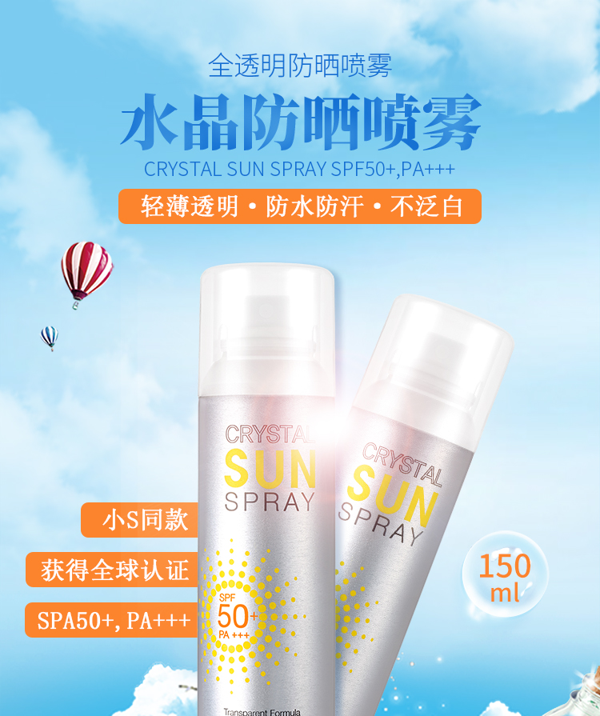 拥有高防晒指数SPF50+PA+++,是目前世界最高防晒指数,防晒时间长达12小时,有着如羽毛般轻盈的质地,丝毫没有浮白迹象,360度自由喷湿的设计,脸部及全身均可无死角方便使用。蕴含有多种自然成分,防晒之余也具备补水、保湿、滋润、修护、效果,皮肤表面快速成膜,防水防汗清爽不油腻,隐形不脱妆,长达一整天。