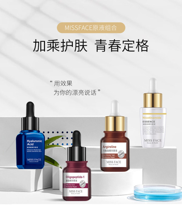 寡肽精华原液:深入修护肌肤表皮,水润滋养,淡化痘印,减少多于油脂分泌,净化肌肤,使肌肤柔滑细腻。