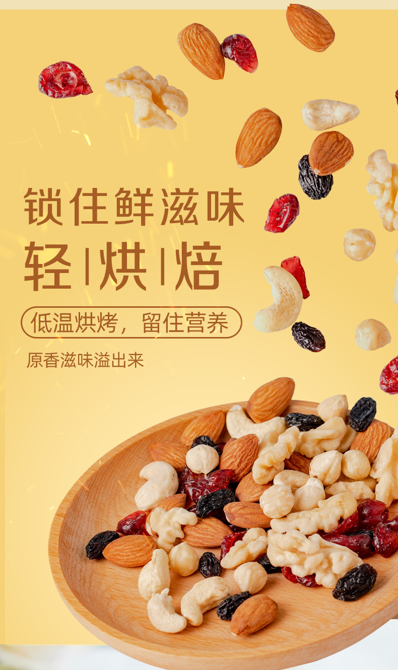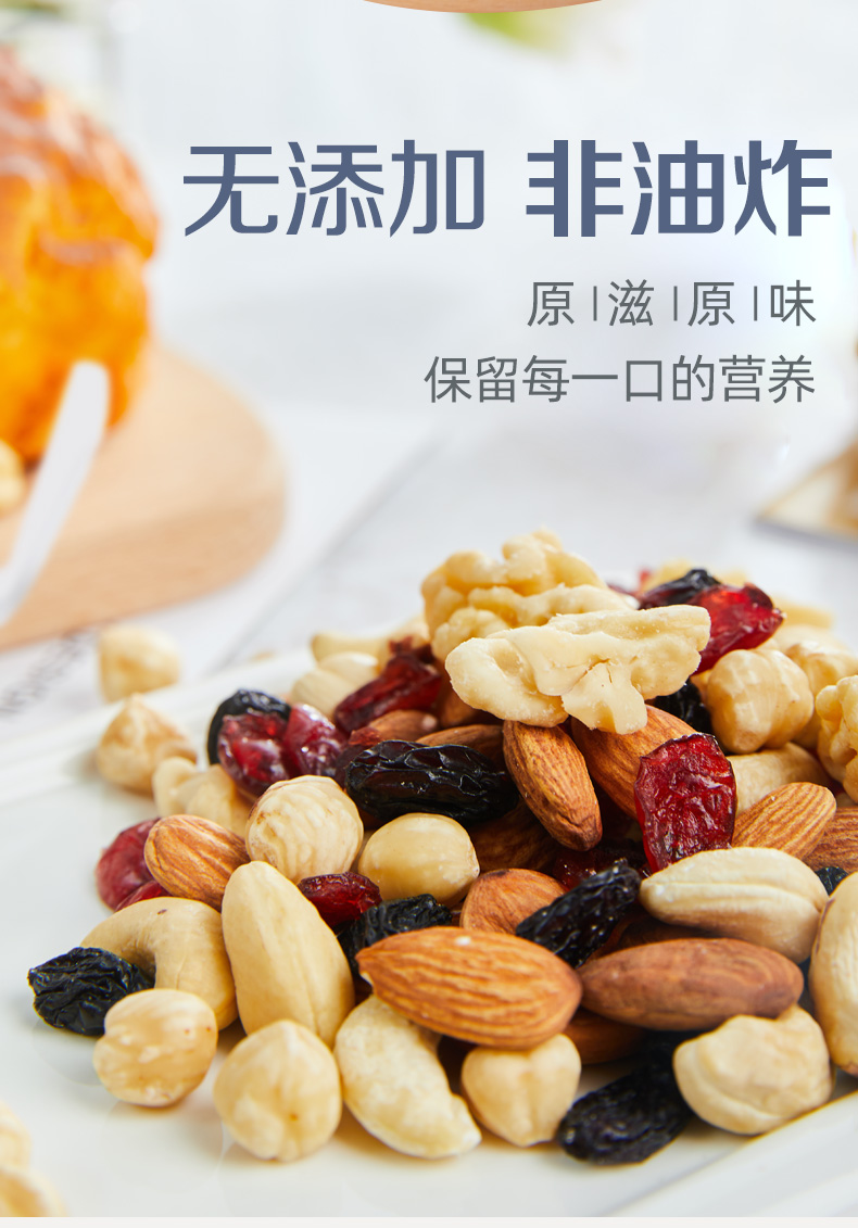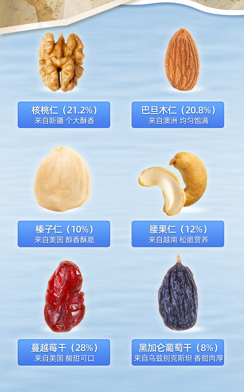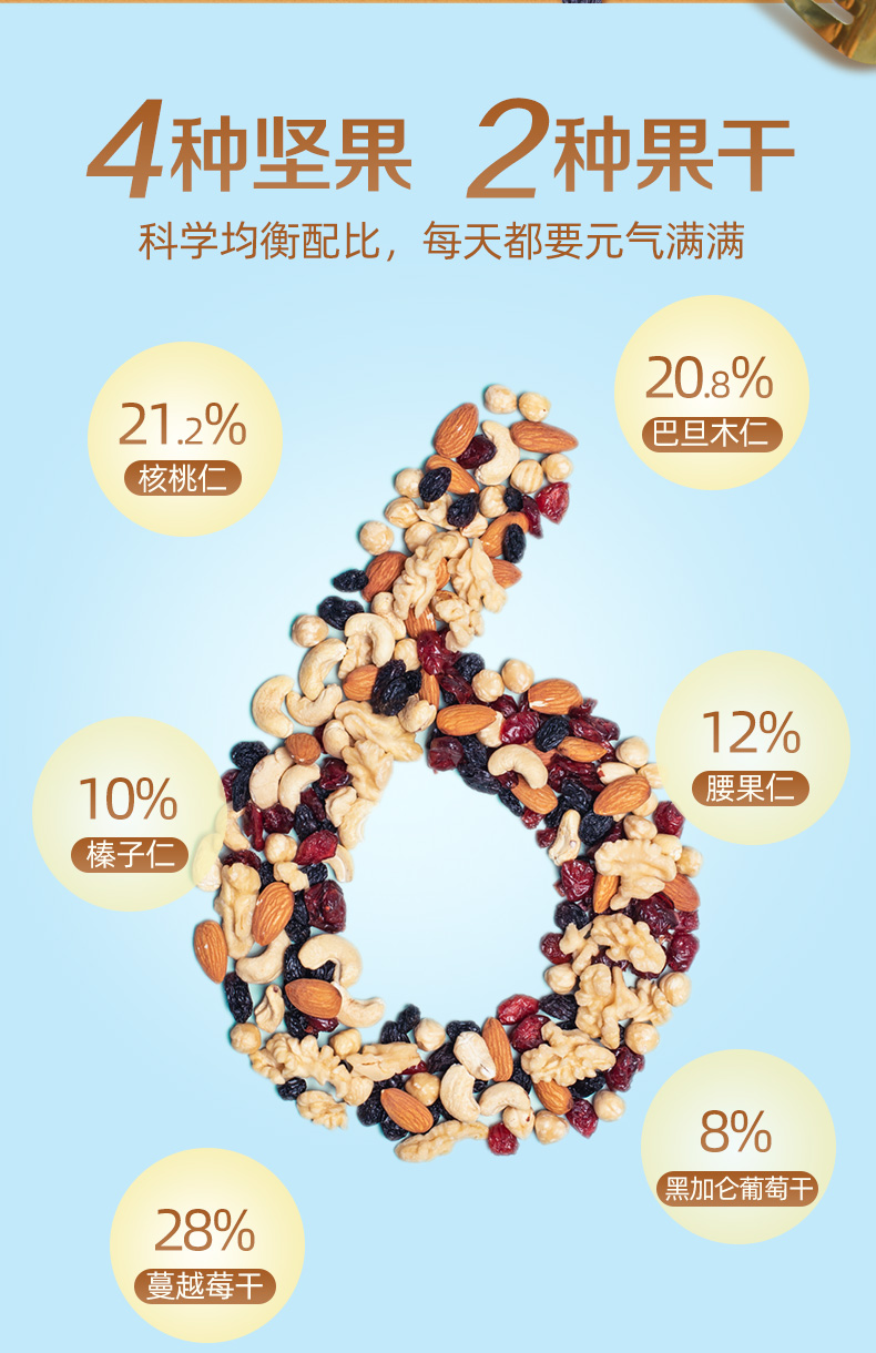 含4种坚果+两种果干(21.2%新疆核桃仁、20.8%澳洲巴旦木仁、10%美国榛子仁、12%越南腰果仁、28%美国蔓越莓干、8%乌兹别克斯坦黑加仑葡萄干) 6种营养一次补充,科学搭配,营养好吃,休闲时刻来一袋,美味停不下来~