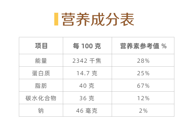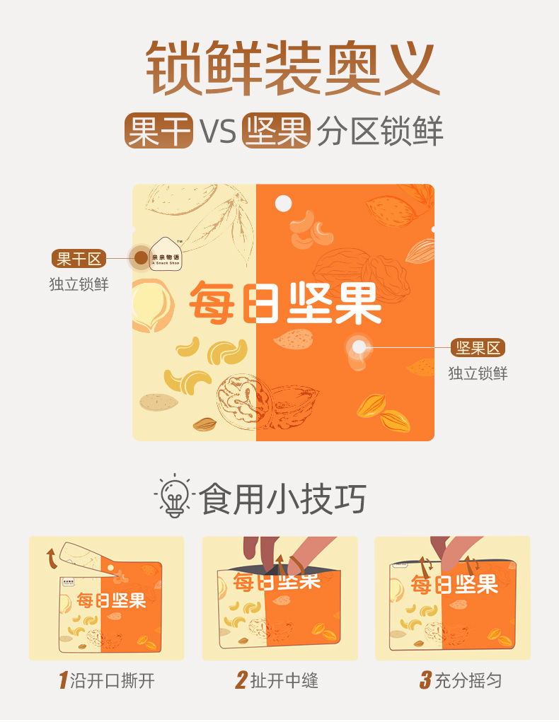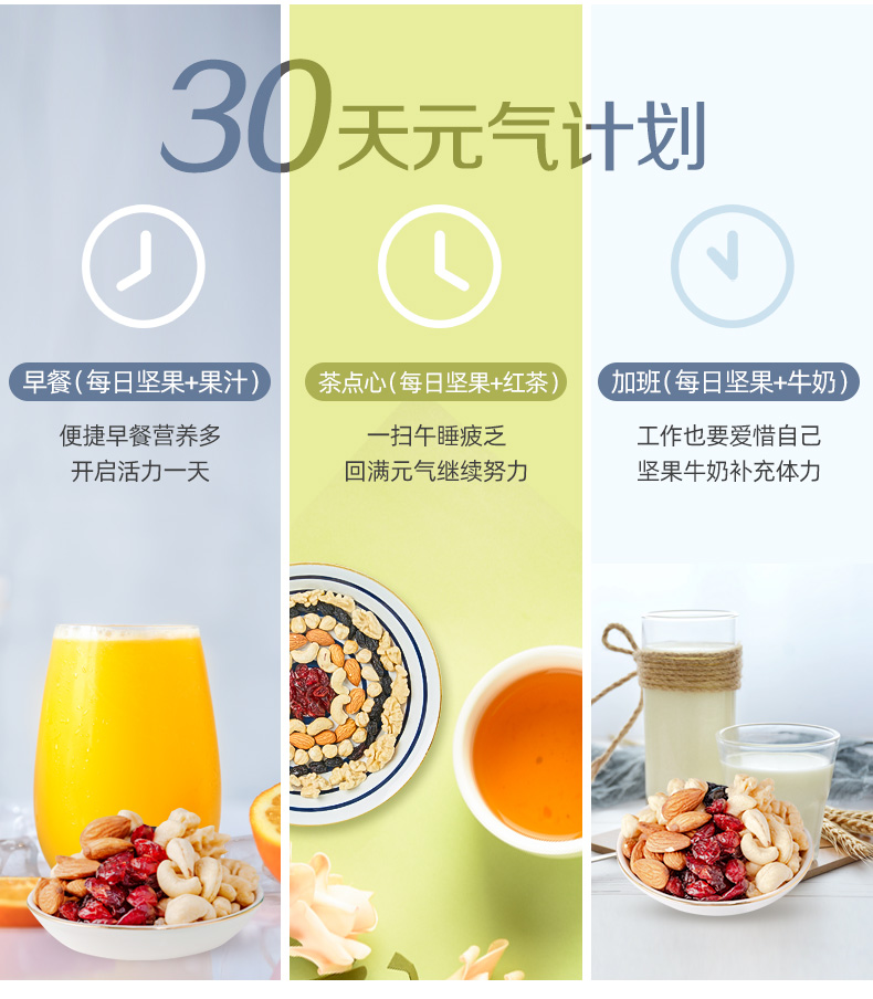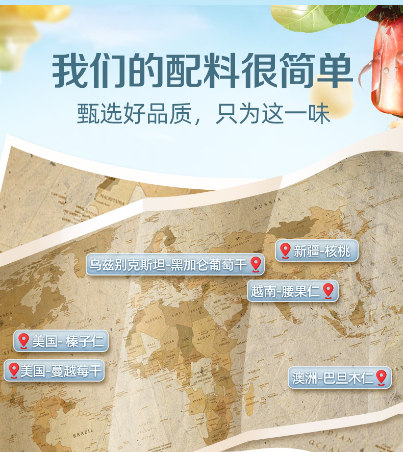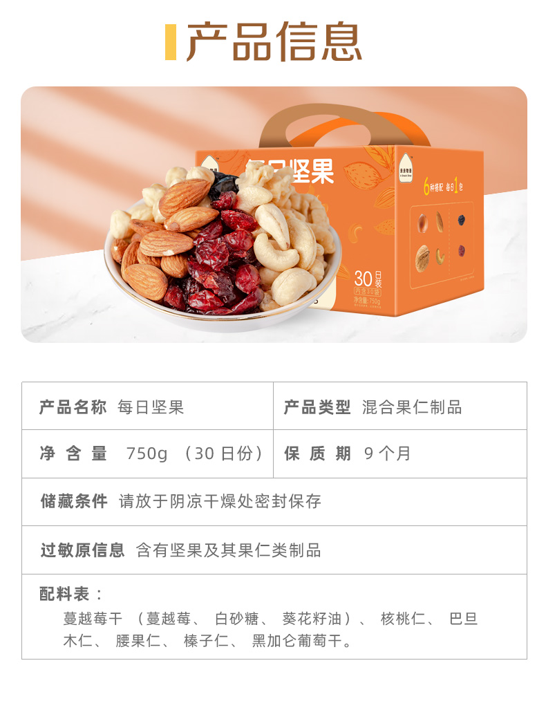 含4种坚果+两种果干(21.2%新疆核桃仁、20.8%澳洲巴旦木仁、10%美国榛子仁、12%越南腰果仁、28%美国蔓越莓干、8%乌兹别克斯坦黑加仑葡萄干) 6种营养一次补充,科学搭配,营养好吃,休闲时刻来一袋,美味停不下来~