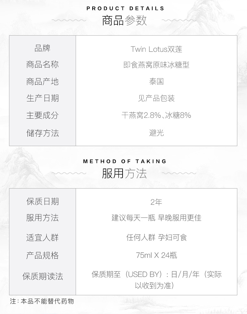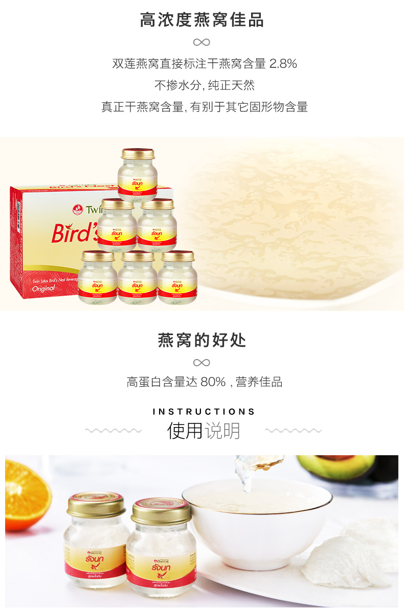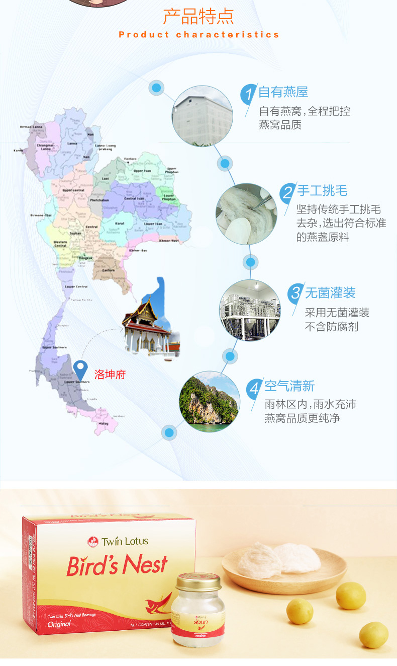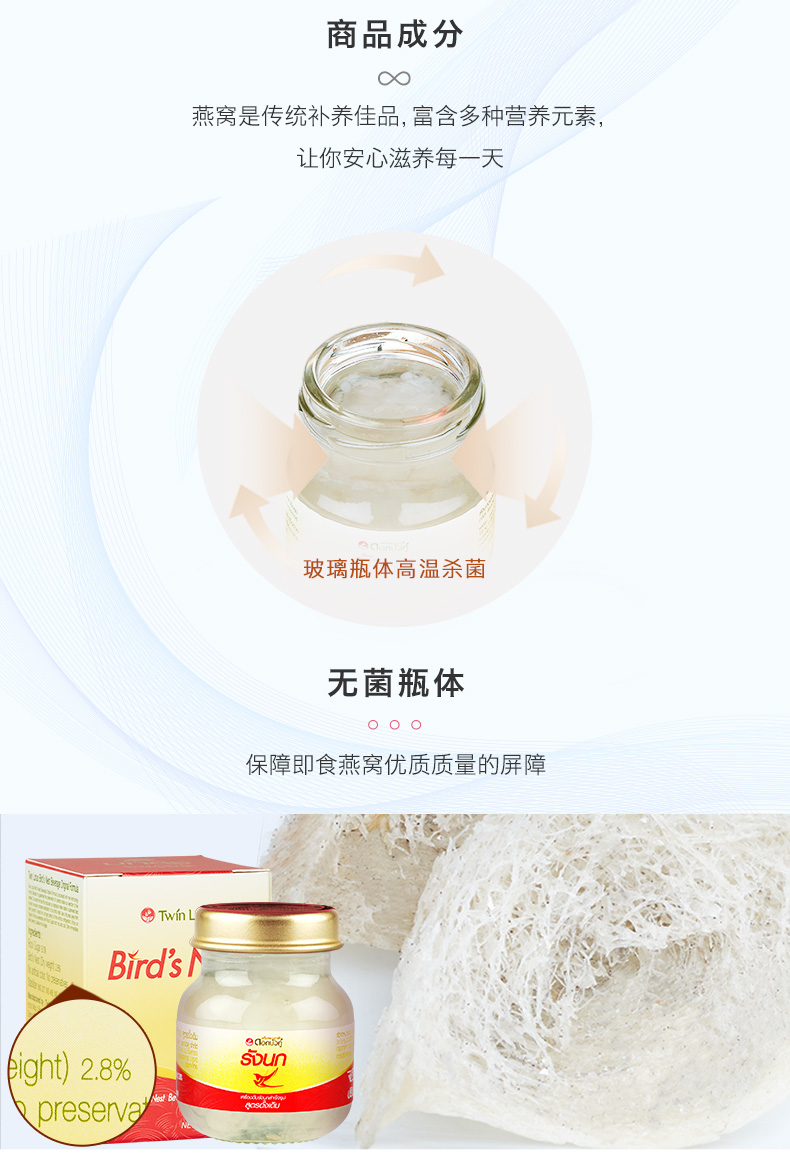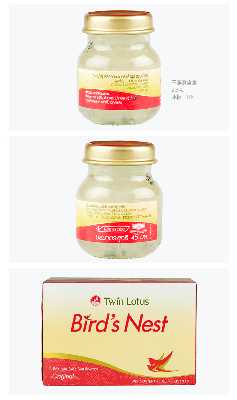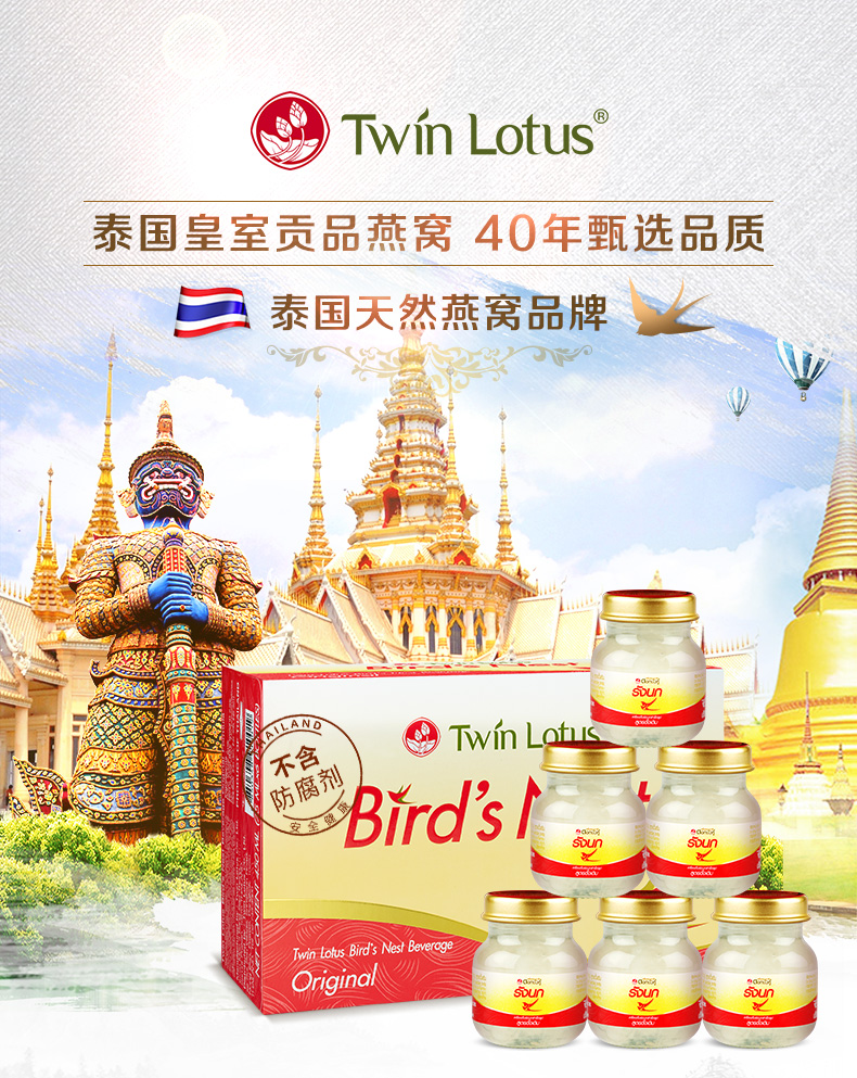 双莲TwinLotus是泰国是正经的老牌燕窝品牌,产自泰国大自然保护区洛坤府,品质全程掌控。前泰国燕窝商会会长、燕窝专家功拉萨·乐拍木的极力称赞,并成为进贡泰国皇室的滋养佳品。