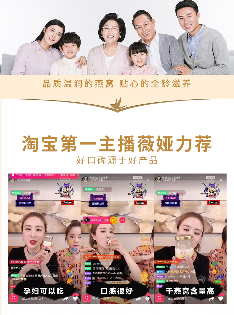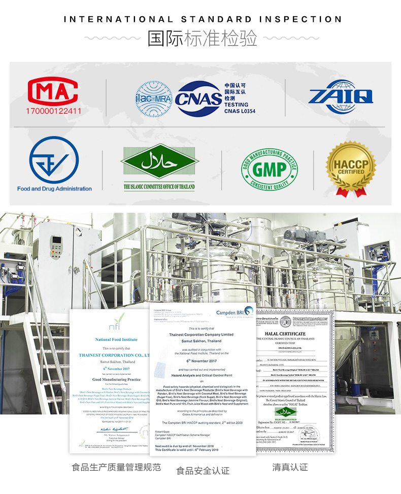 在生产过程中,无漂白、无任何化学污染,全部采用标准化生产工艺及高温灭菌压力系统进行,没有防腐剂,拒绝任何添加剂,严格把关每一批每一盏燕窝原料,使其完全符合安全标准,保证口感的浓厚纯正,营养价值高。
