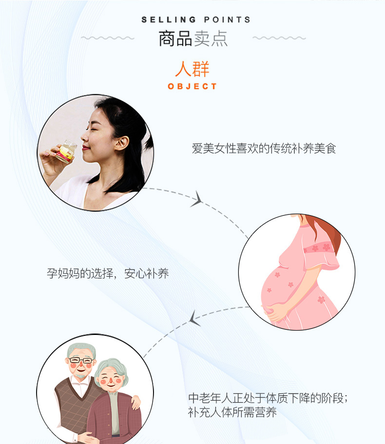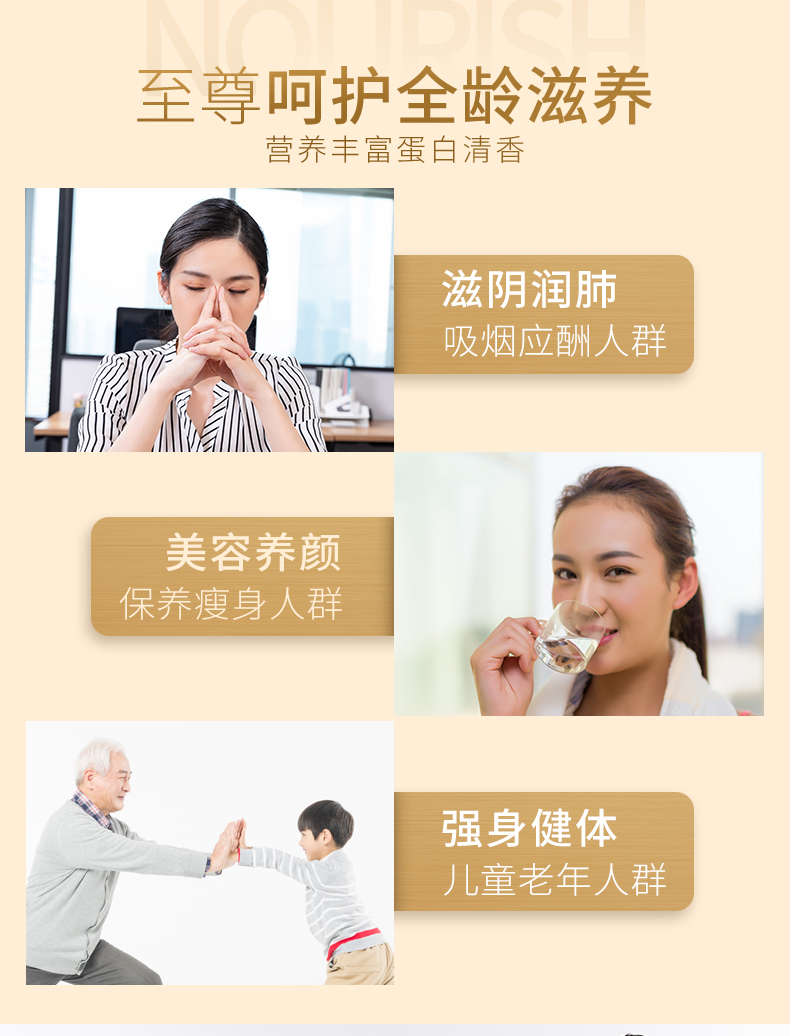 对女性而言,尝吃燕窝,能使得皮肤光滑、有弹性和光泽,从而减少皱纹。同时燕窝中所含的多种氨基酸,对于婴幼儿和儿童非常有滋补效果,常吃能长智慧、增加思维、抗敏感、补其先后天之不足。