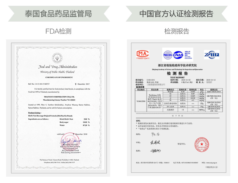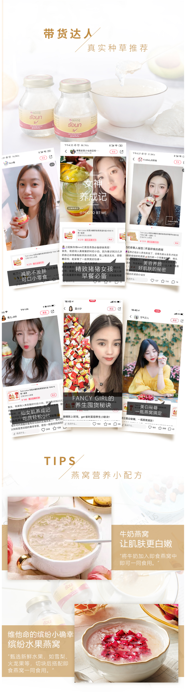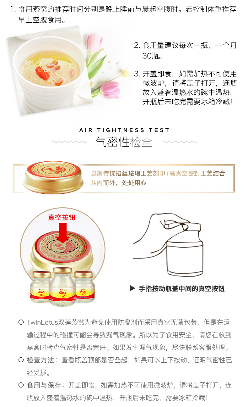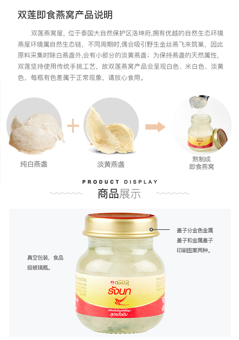 这款双莲即食燕窝,泰国原装进口,是原味冰糖型,主要成分是燕窝2.8%+8%冰糖,不掺水,纯正天然。