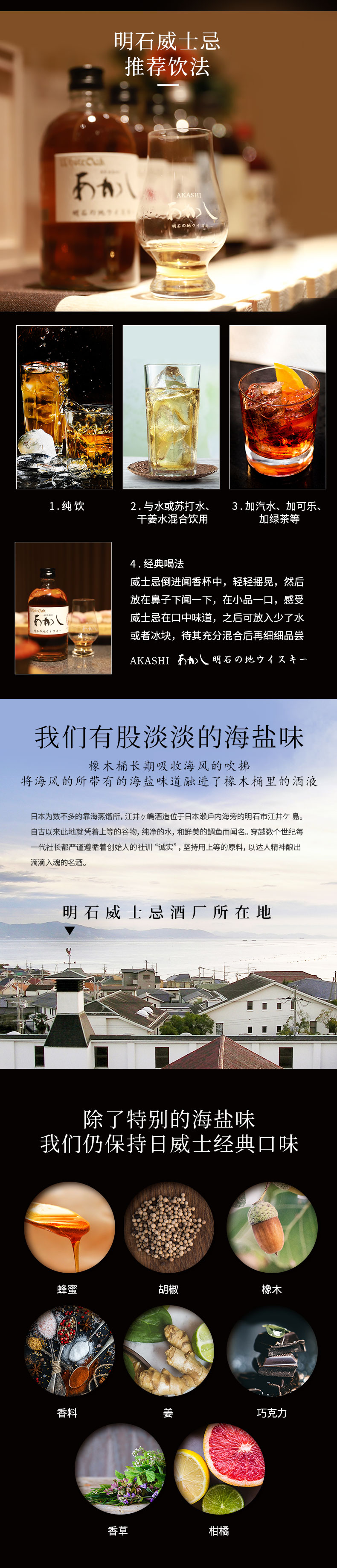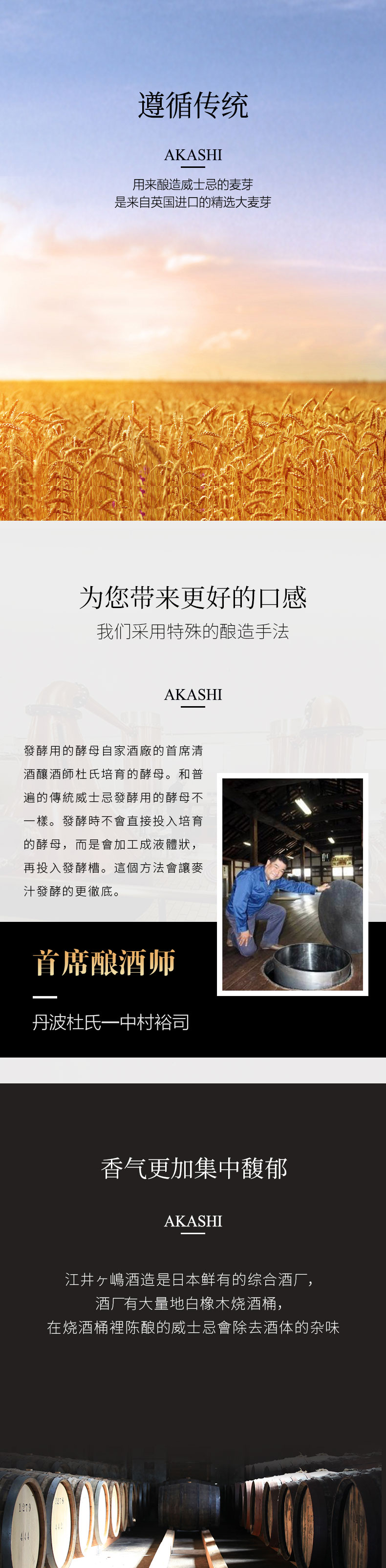 明石威士忌,每年蒸馏3个月,年蒸馏量只有5万公升!精选来自英国进口的优质大麦芽,首席酿酒师 丹波杜氏一中村裕司 培育的酵母,发酵时不会直接投入培育酵母而是会加工成液体状,在投入发酵槽,这样会让麦汁发酵更彻底。最后在发酵桶里陈酿的威士忌会出去酒体杂味,口感更滑顺柔和。