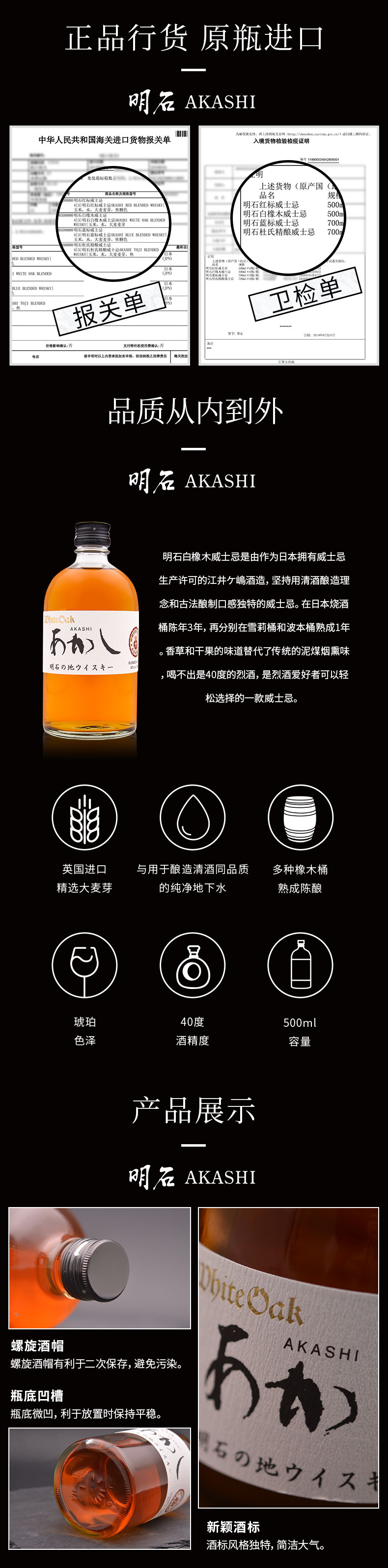 此款AKASHI明石 白橡木威士忌,需在日本烧酒桶(美国白橡木)陈年3年,再分别在雪莉桶和波本桶熟成2年,前后总共长达5年时间。相比于红标(烧酒桶1年+雪莉桶和波本桶2年)、蓝标(烧酒桶2年)时间更长。最后香草和干果的味道替代了传统的泥煤烟熏味,口感更滑顺柔和,喝不出是40度的烈酒,是烈酒爱好者可以轻松选择的一款威士忌。