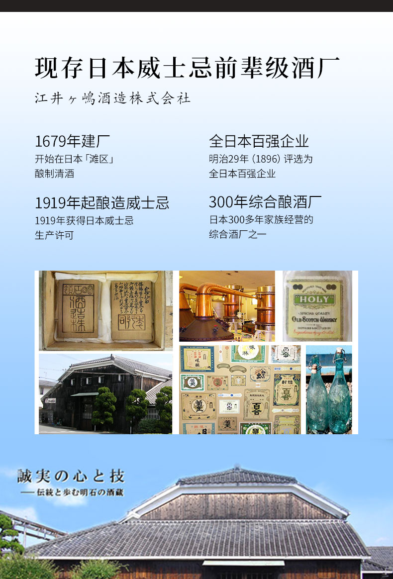 明石蒸溜所(Akashi)隶属的江井ヶ嶋酒造。江井ケ嶋酒造是日本极少有着数百年历史的综合酿酒厂。从1679年开始生产日本酒起至1888年成立株式会社,到1919年得到日本第一个生产威士忌的执照,江井ケ岛酒造堪称日本酿酒界的国宝级先驱。在日本鼎盛时期的明治年间,江井ケ岛酒造也多次被评为日本的百强企业。