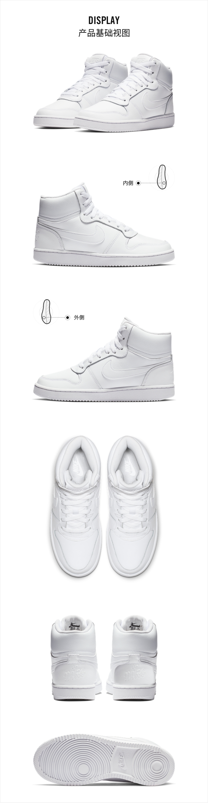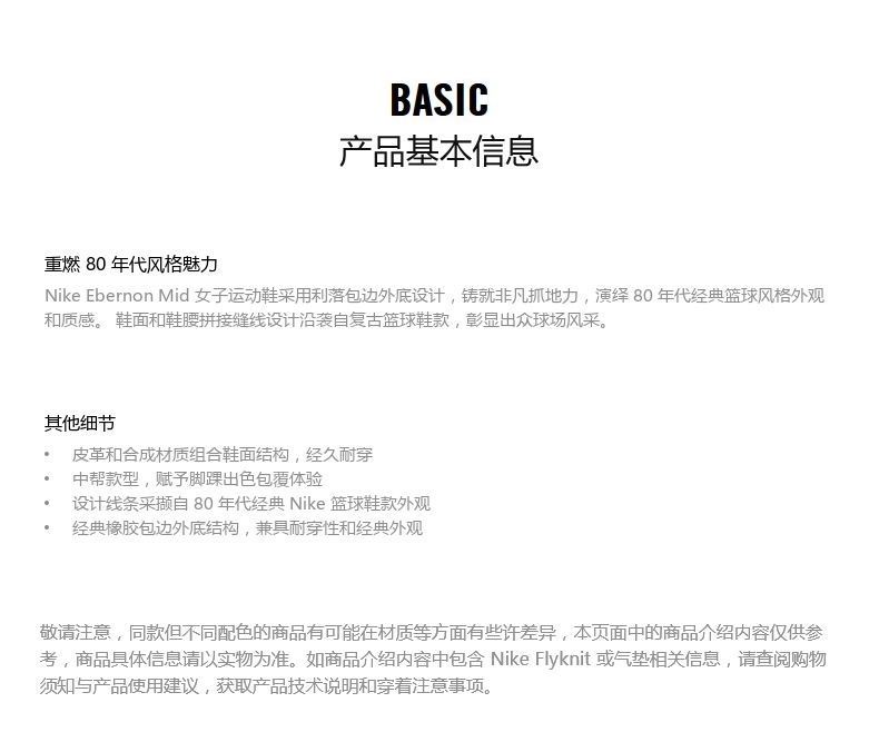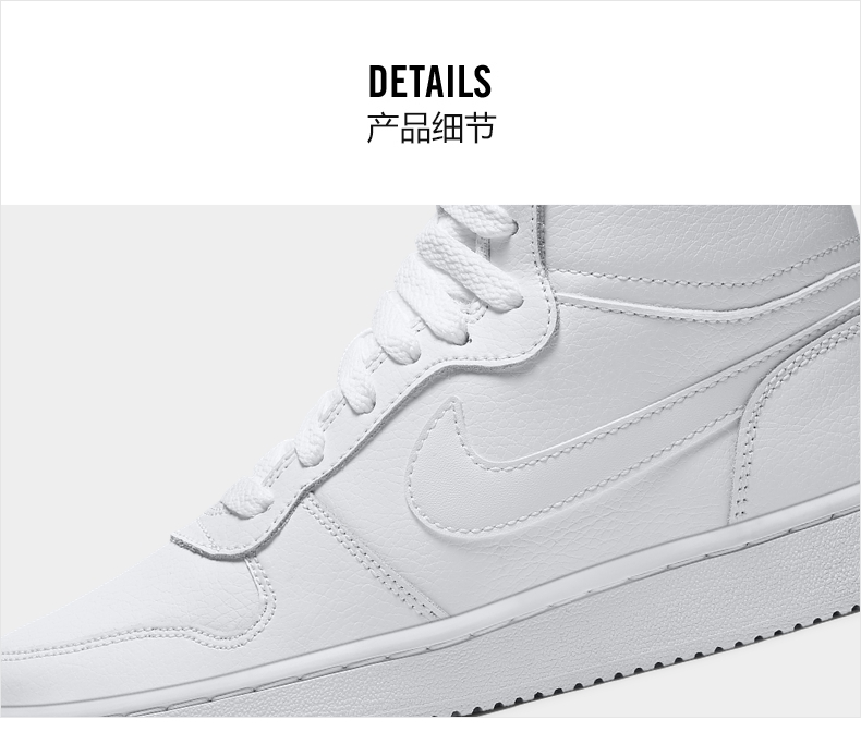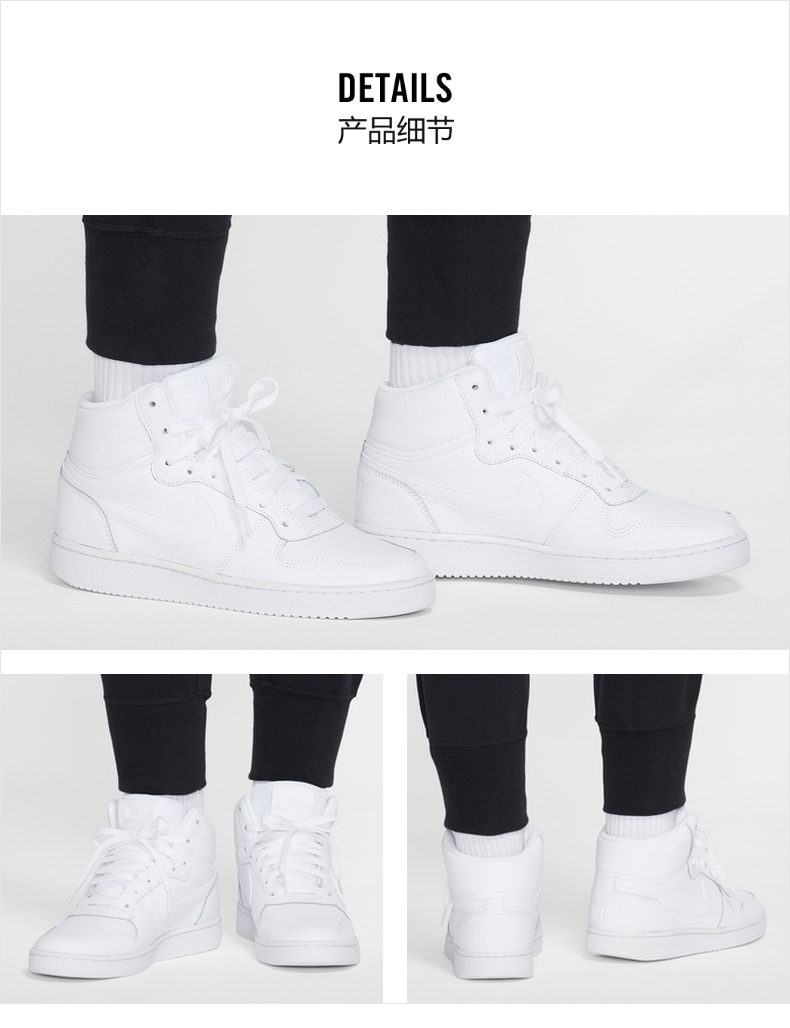 这款耐克 Nike Ebernon Mid女皮面高帮运动休闲鞋,是18年的冬季款,款式上经典篮球鞋外观,鞋面和鞋腰拼接缝线设计沿袭自复古篮球鞋款,中帮款型。橡胶包边外底结构,拥有不错的抓地力和质感,兼具耐穿性和经典外观。