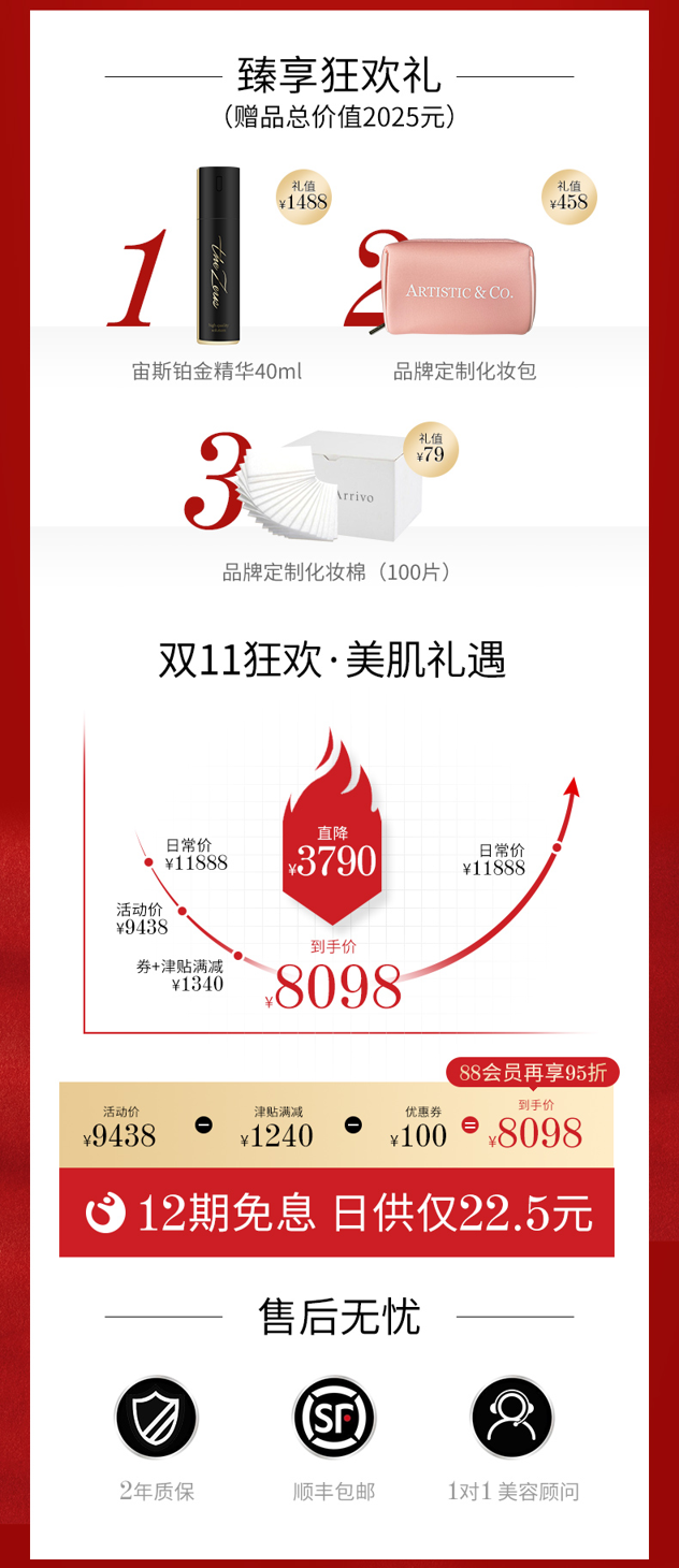 =8048元 到手价。MISS.Arrivo全新幻影24K金美容仪,不仅拥有+MFIP(中周波频率断续电刺激)功能,还拥有比旧款高达1.2倍的输出功率,让提拉效果更佳明显,另外高功率输出同时也让EMS的刺激频率达到了每秒钟9万次,促进肌肤下的毛细血管血流量,来让美容液吸收的充分。