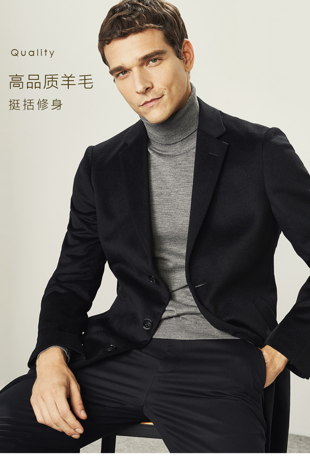 领子是平驳领,领型自然服帖,优雅大气,可胜任任意场合。内袋的设计简约实用,走线工整,彰显了品质。立体的剪裁和精湛的做工,简约不失品味,上身很显气质,非常显成熟稳重的男人魅力。