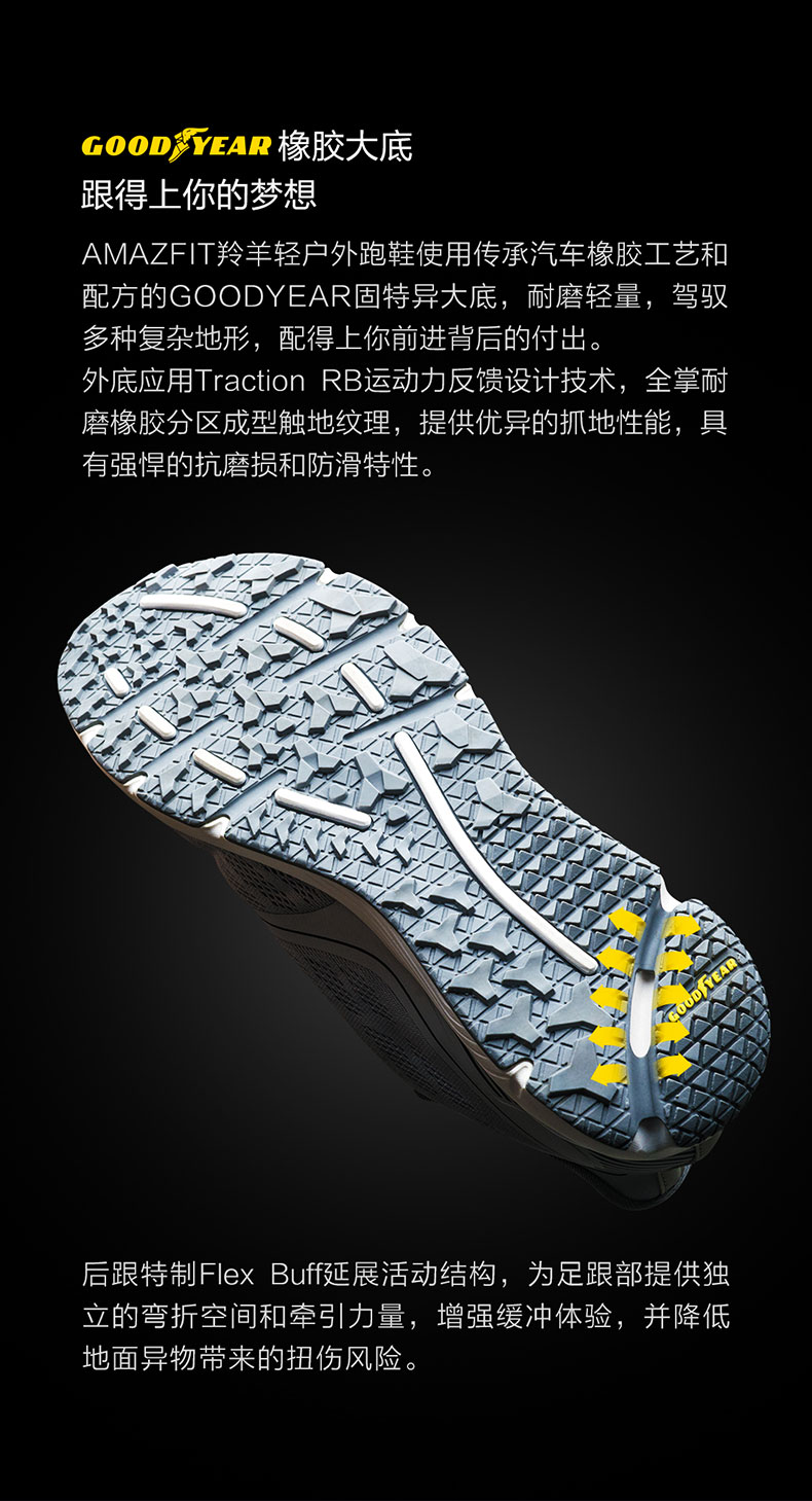 为了应对户外的复杂路面,大底使用了GOODYEAR固特异大底,并根据需要在不同区域使用特备设计的防滑纹路,抓地性能出色。后跟特制Flex Buff延展活动结构,为足跟部提供独立的弯折空间和牵引力量,增强缓冲体验,并降低地面异物带来的扭伤风险。