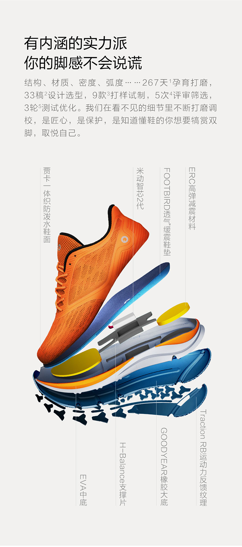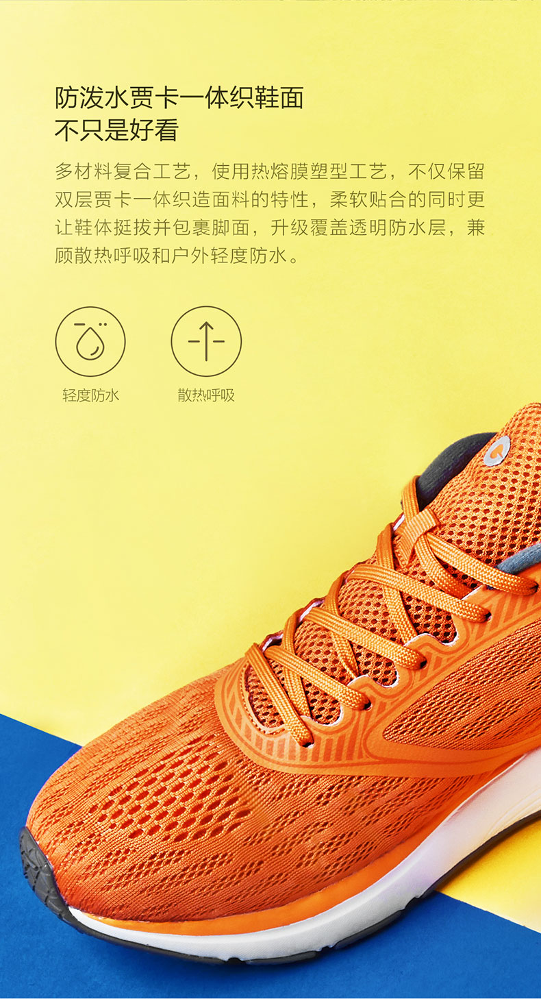 由多次获奖的设计团队操刀,贾卡一体织鞋面经过防泼水处理,不仅轻柔贴合而且有不错防水透气性能。中底方面,前后掌都使用了创新ERC科技面料,缓震性能颇为出色,通过了10米高度摔鸡蛋实验测试。
