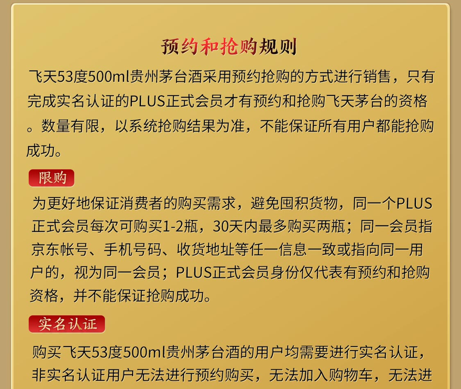 京东自营,11月11日18点,Plus会员,可抢茅台飞天53度,售价1499元现货,每人限购2瓶,每个账号30天内限参与1次抢购。