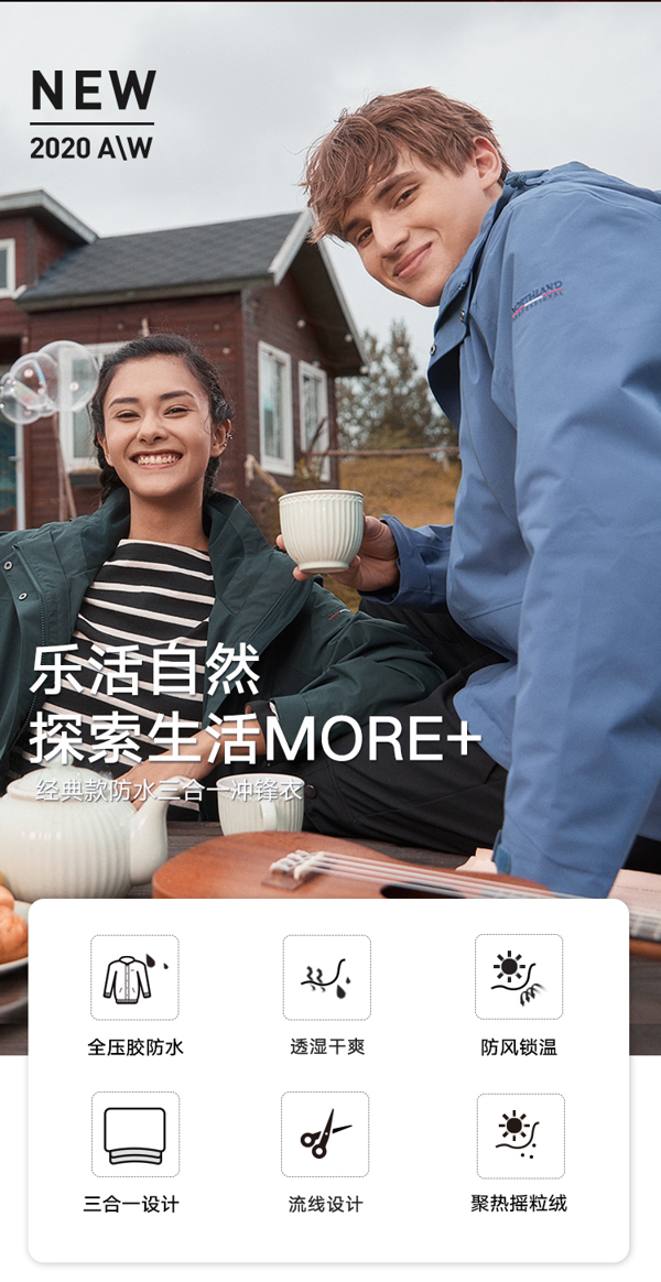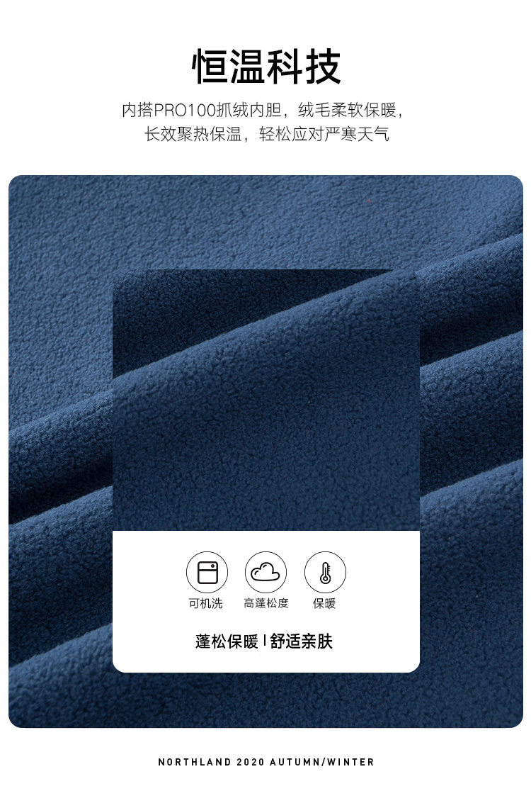 防水透湿科技 防泼水 抓绒内胆 柔软保暖。