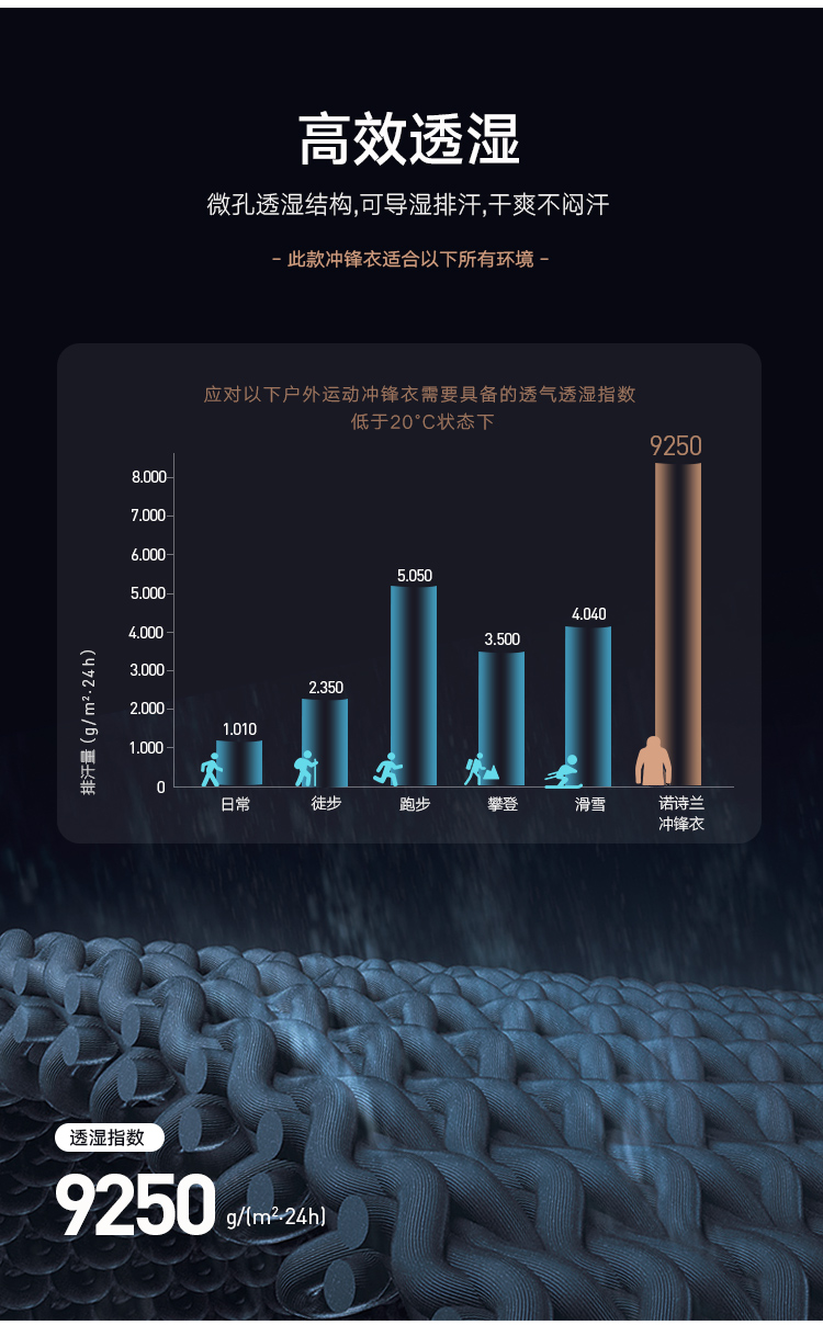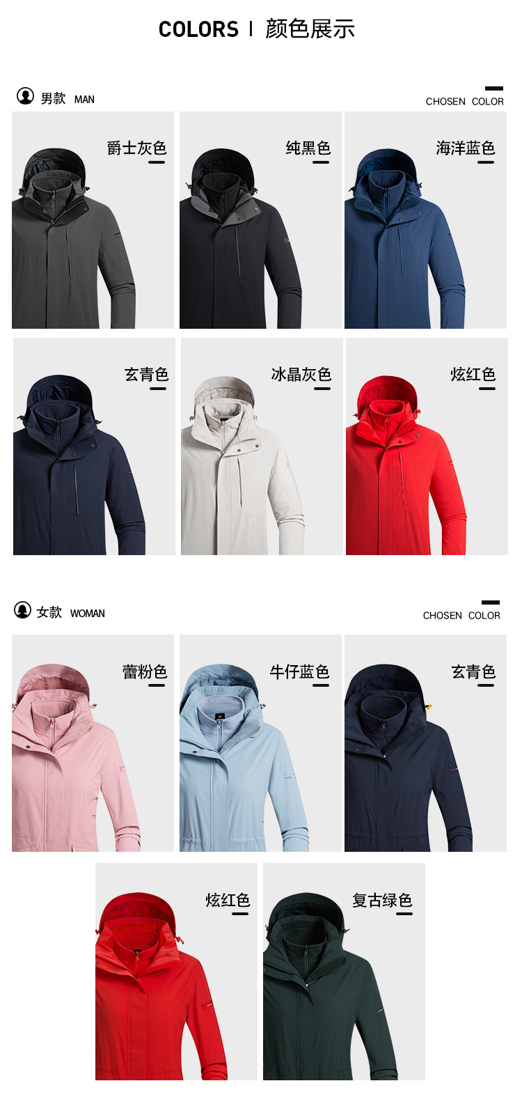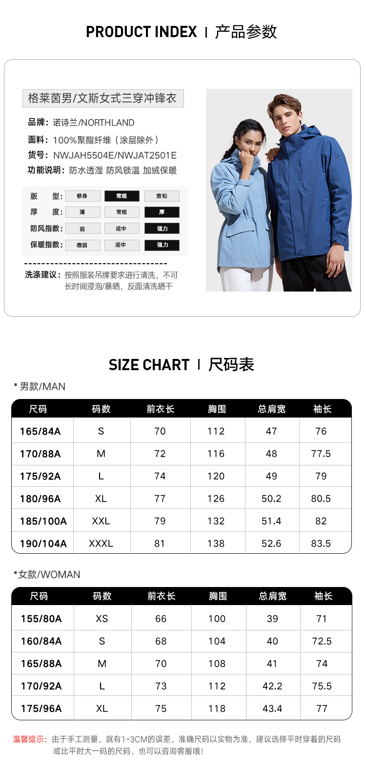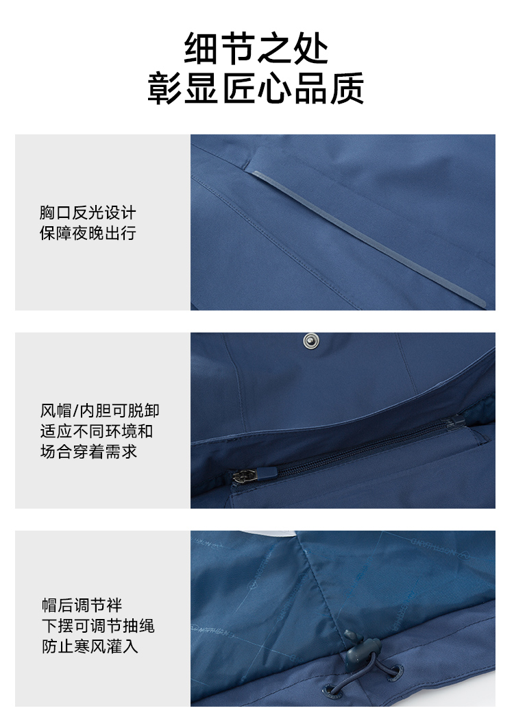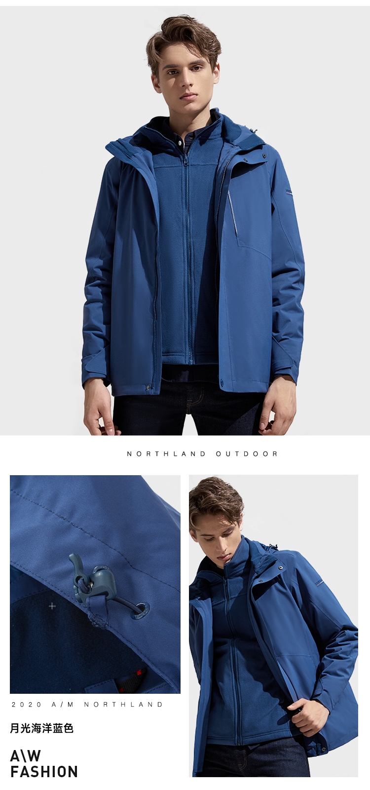 这款诺诗兰三合一冲锋衣采用防水透湿科技,采用全压胶技术,可达到暴雨级防水,透湿指数5000g+,内里采用pro100加绒内胆,保暖性能优异,且手感细腻不易起静电,穿着亲肤舒适。