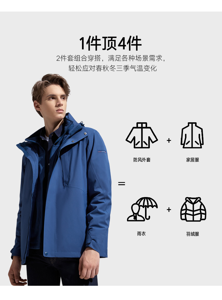 三合一也叫两件套冲锋衣,其实是两件衣服,外层是具有防风防水功能的冲锋衣,带三合一系统,里面多出来一套拉链,可以和里层的抓绒(或棉服、羽绒服)拉在一起,这样能当成一件穿,同时具有(单穿内胆、单穿外层、两件一起穿)三种穿法。
