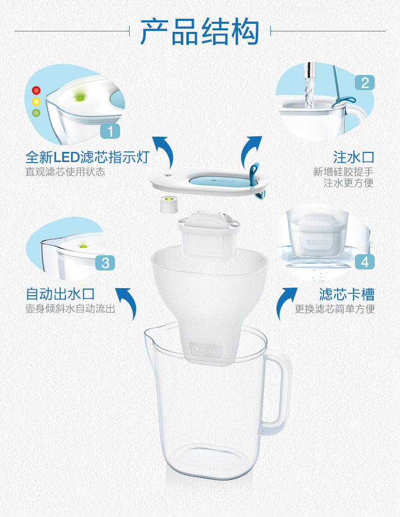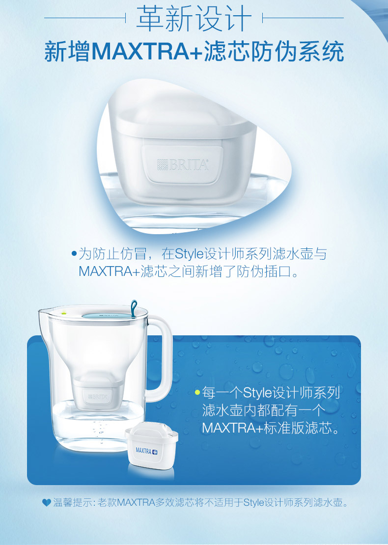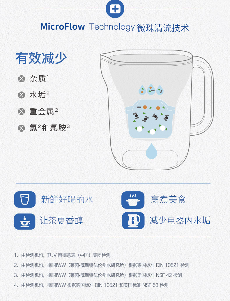 滤芯方面,德国原装进口的Maxtra+,比传统的一代滤芯在过滤能力方面增加了20%,还改良了MicroFlow Technology 微流控技术,使水的味道比以往更好。滤芯中所含的活性炭,能有效过滤水中的重金属、水碱、杀虫剂、有机杂质、氯气和异味。
