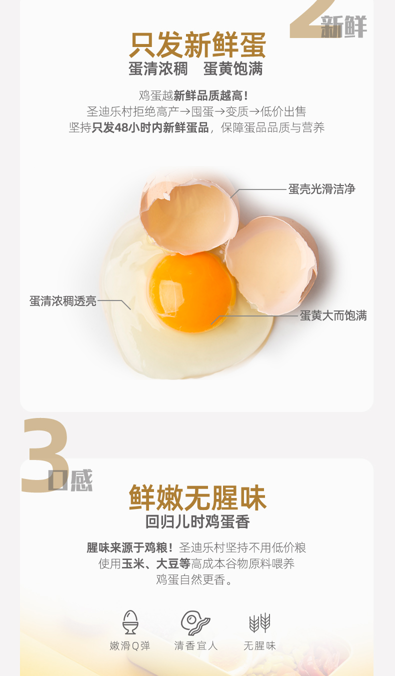 圣迪乐村是国宴峰会指定的蛋品供应商,采用德国罗曼种鸡,谷物喂养,每一个蛋品都可溯源,拒绝使用抗生素激素,同时引进MOBA设备,通过紫外线杀菌,至今未检出沙门氏菌,是放心安全的鲜鸡蛋,达到A级标准。