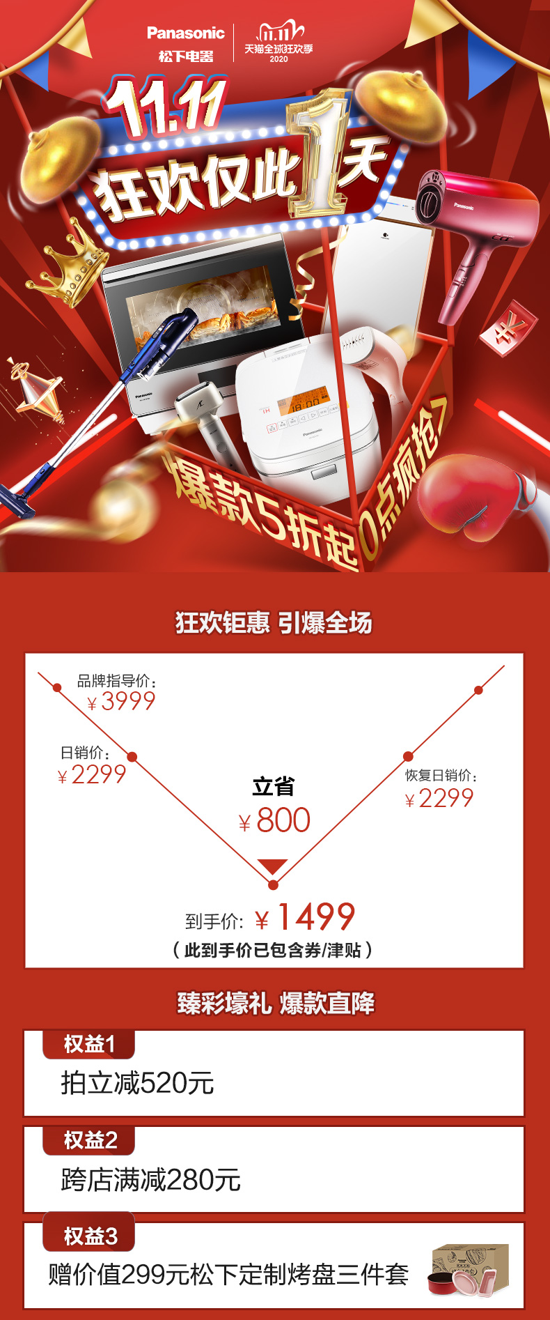天猫松下电器旗舰店,¥2299元 狂欢价,-720元 下单立减,-100元优惠券,-280元 (每满300减40元)跨店满减,=1199元 到手价,下单还赠定制烤盘3件套,我哥们今年年初1900+买的,刚才我把这个好价发给他看,正琢磨怎么找客服保价呢。这款JK101W是松下全网全网销量最高的蒸烤箱,评价也一直不错。