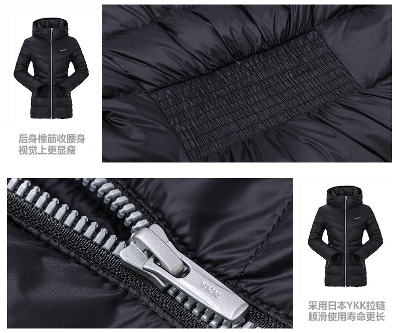 在款式和细节上,修身版型,后腰部分添加了橡皮筋设计,上身更加显瘦。帽子可拆卸,可调节松紧搭配高领设计,更加贴合保暖。弹力防风袖口,防止倒灌冷风,门襟是YKK拉链。