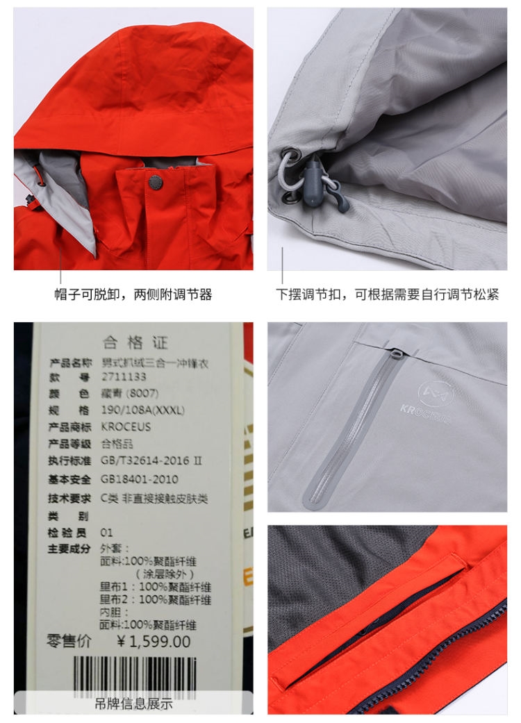 所谓的三合一也叫两件套冲锋衣,其实是两件衣服,外层是具有防风防水功能的冲锋衣,带三合一系统,里面多出来一套拉链,可以和里层的抓绒(或棉服、羽绒服)拉在一起,这样能当成一件穿,同时具有(单穿内胆、单穿外层、两件一起穿)三种穿法。