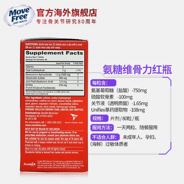 这款维骨力 氨基葡萄糖软骨素,是红盒,美国原产,作用是强化骨质骨骼,修补软骨组织,恢复关节活力,适用于关节轻度疼痛、运动损伤、劳动损伤的人,对于腰椎、手腕/关节、踝关节、膝关节、肘关节、颈椎均有效果;每日2粒,1次或多次随餐服用,规格是80粒/瓶。