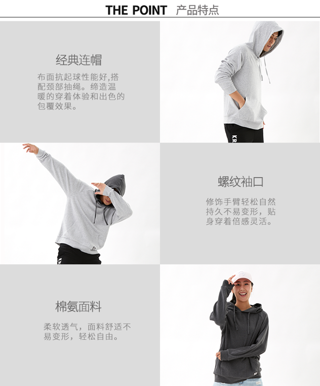 这款卫衣使用棉氨高弹力面料,在棉纤维中混入比较多的氨纶弹力纤维,具有高弹力,舒适随身不紧绷,面料表面经过抗起球处理,不易起球。