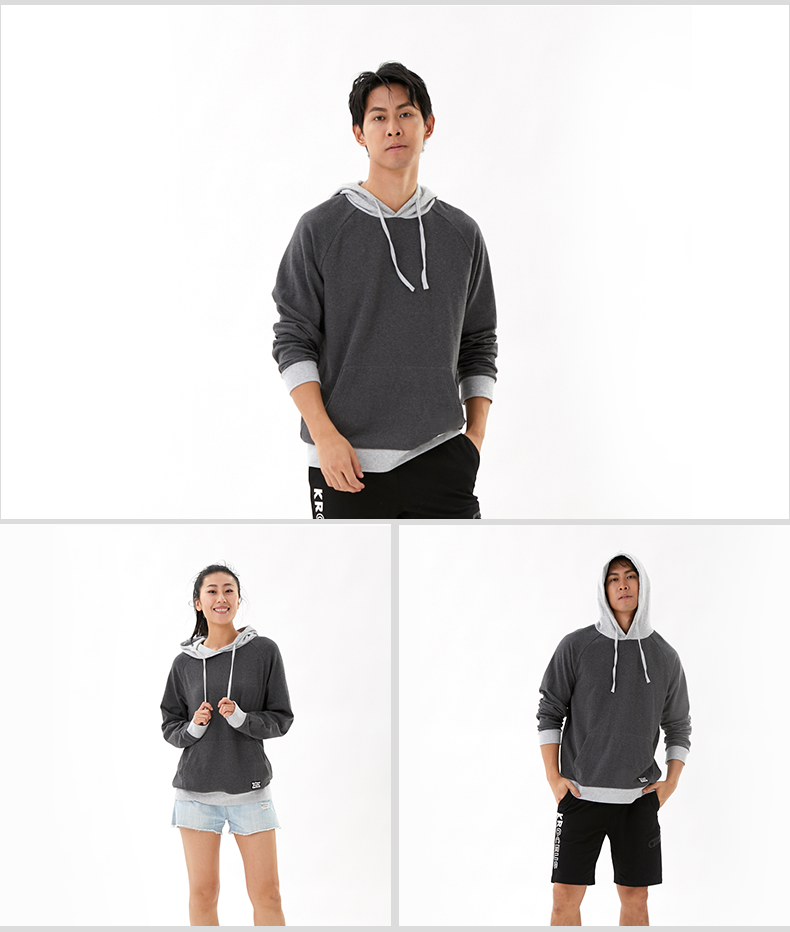 在款式上,是经典袋鼠兜连帽设计,除了纯色款还有拼色可选,我个人比较喜欢「浅麻灰拼深麻灰」,灰色比较百搭,也可作为情侣装。尺码为男女同款,按身高建议选择即可。