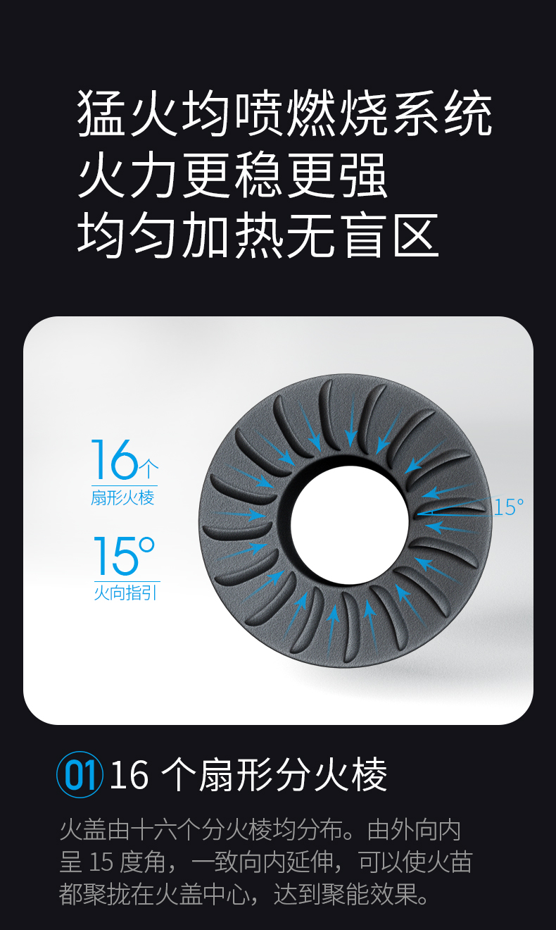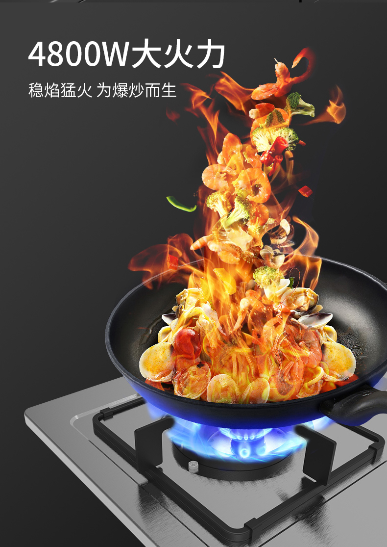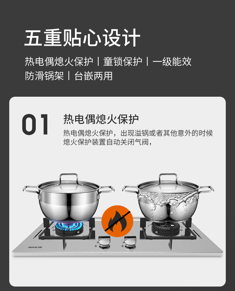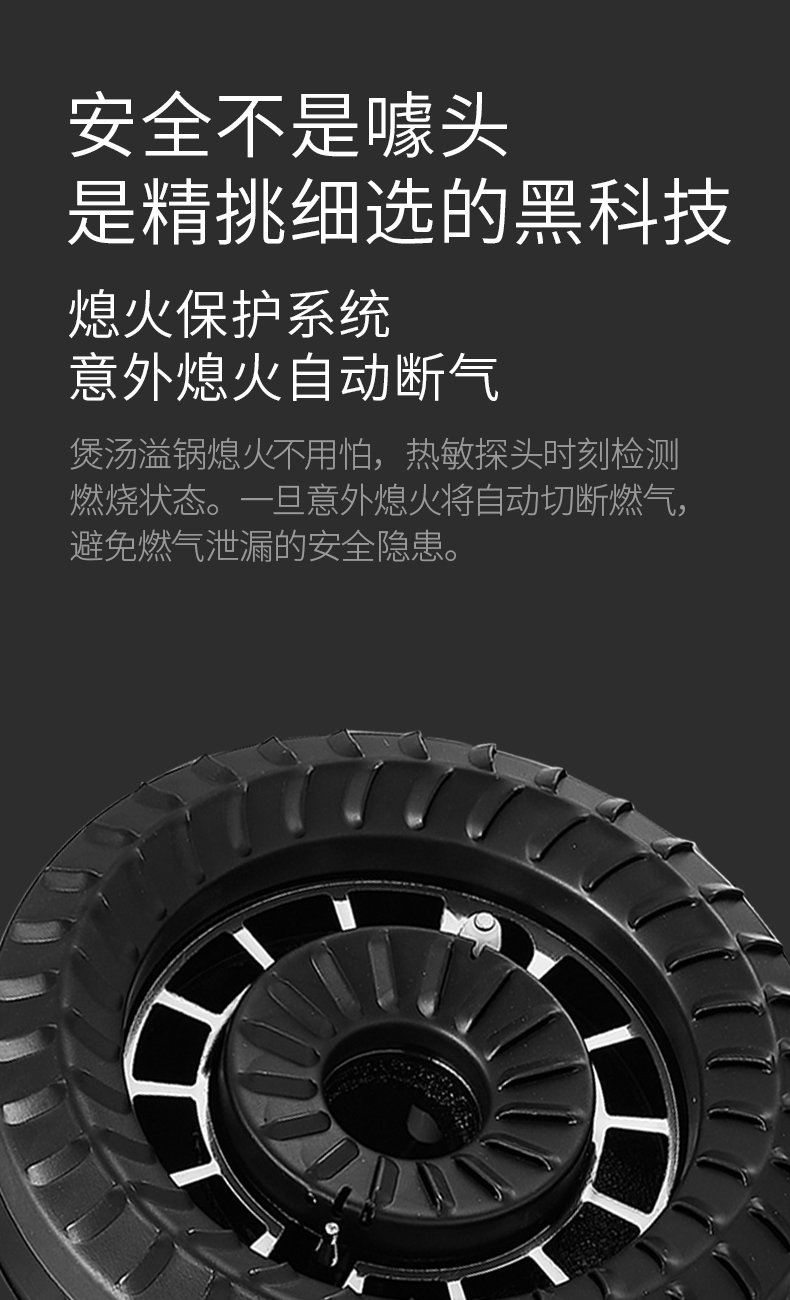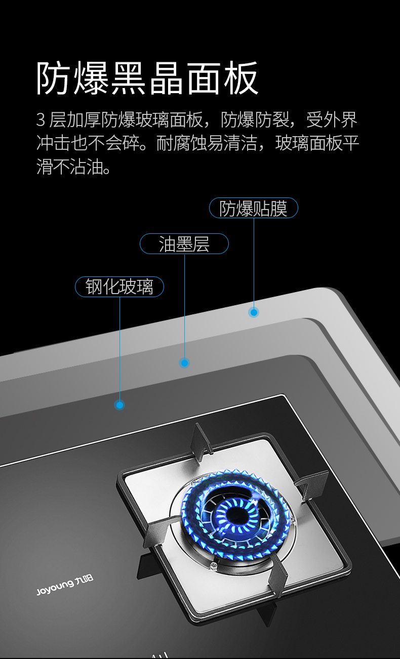 炉灶整体采用钢化玻璃+防爆油墨层+防爆膜,三层防爆防裂,耐腐蚀易清洁。采用猛火均喷燃烧系统,火力更稳更强,均匀加热无盲区,热效率高。精细的火力调节系统,火控精准。采用热敏感探头时刻检测燃烧状态,熄火自动切断燃气,避免安全隐患,使用更安全。