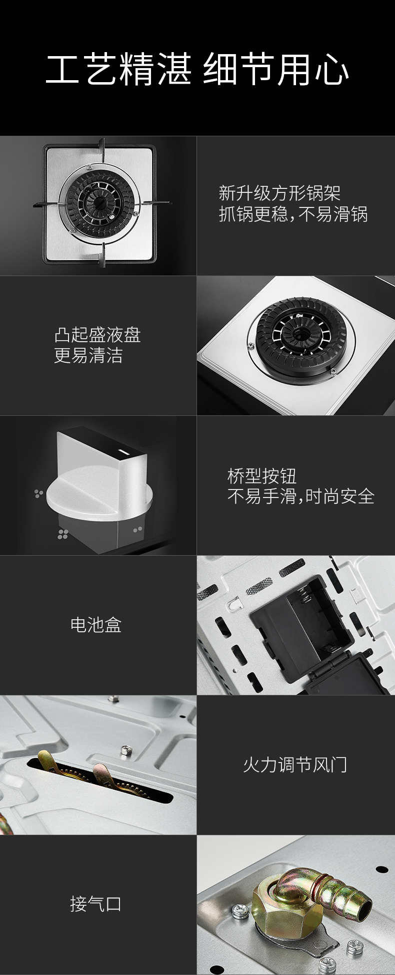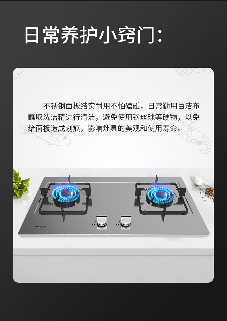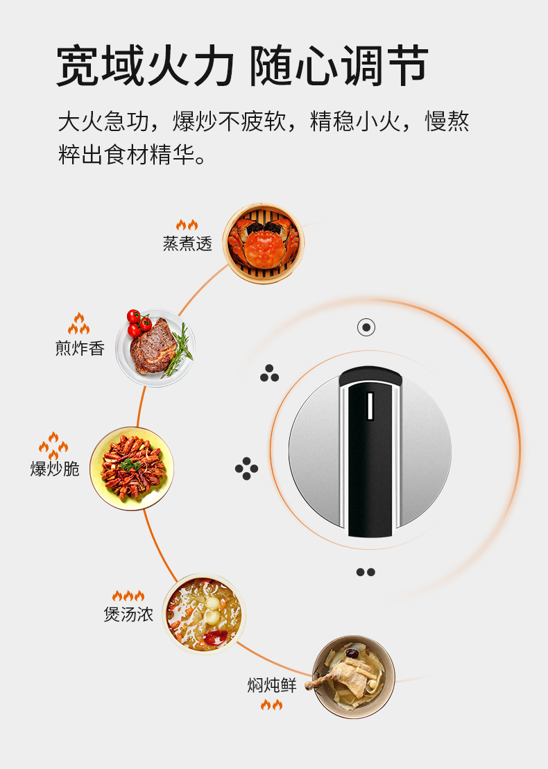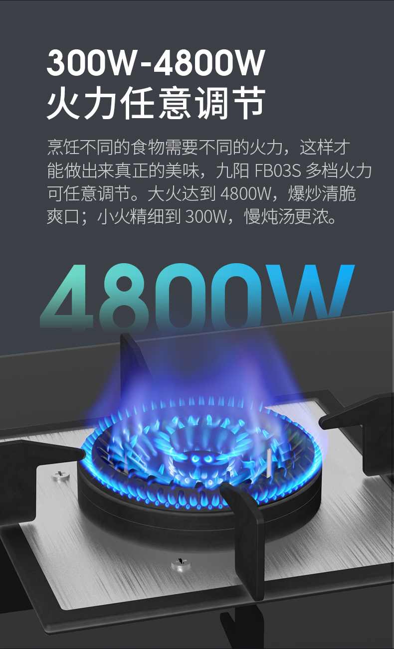 炉灶整体采用钢化玻璃+防爆油墨层+防爆膜,三层防爆防裂,耐腐蚀易清洁。采用猛火均喷燃烧系统,火力更稳更强,均匀加热无盲区,热效率高。精细的火力调节系统,火控精准。采用热敏感探头时刻检测燃烧状态,熄火自动切断燃气,避免安全隐患,使用更安全。