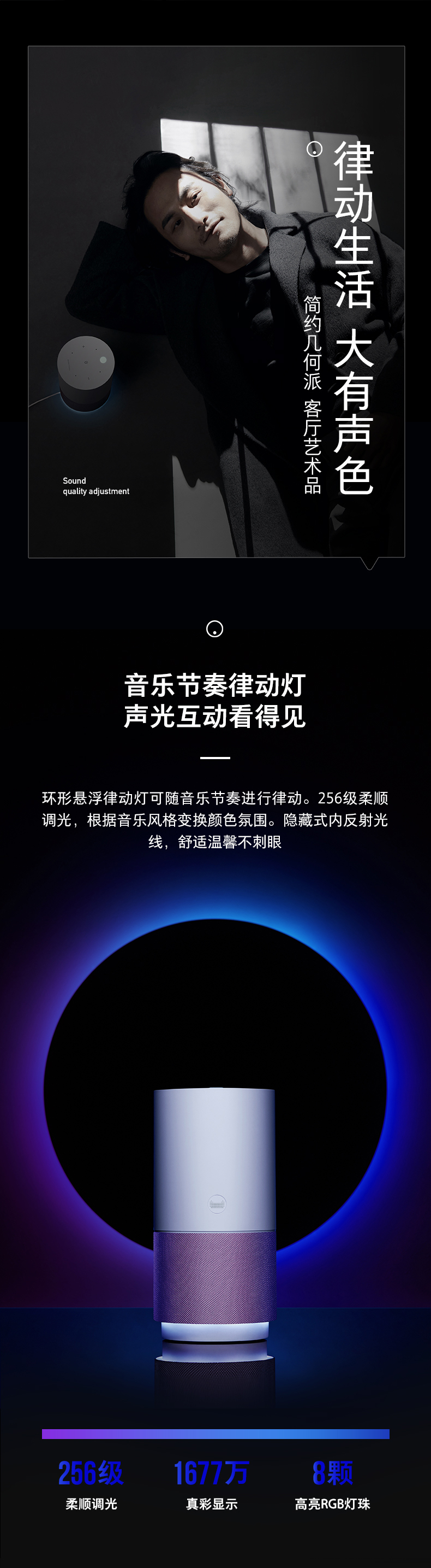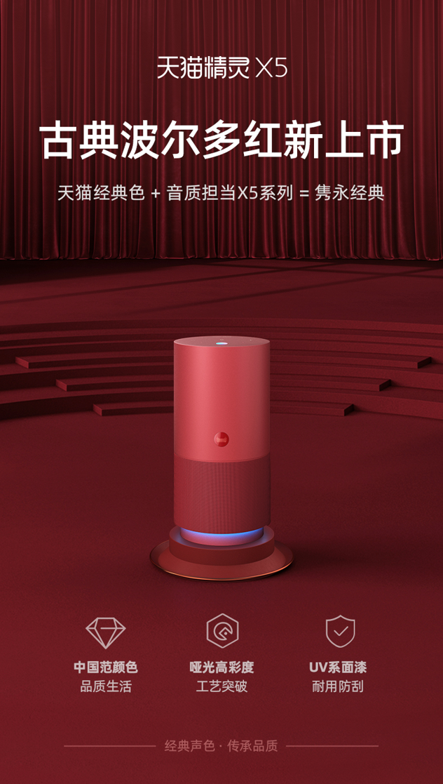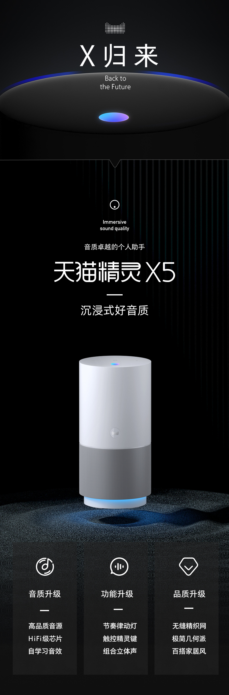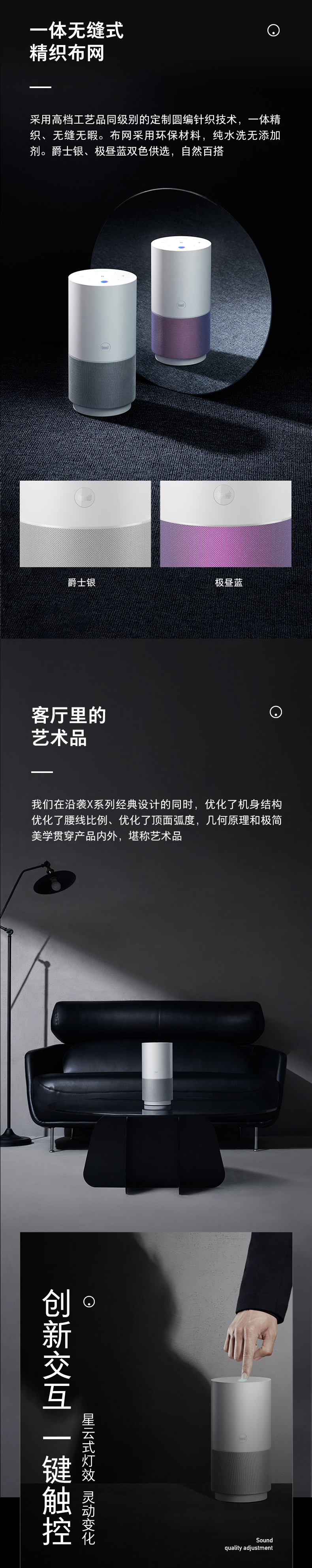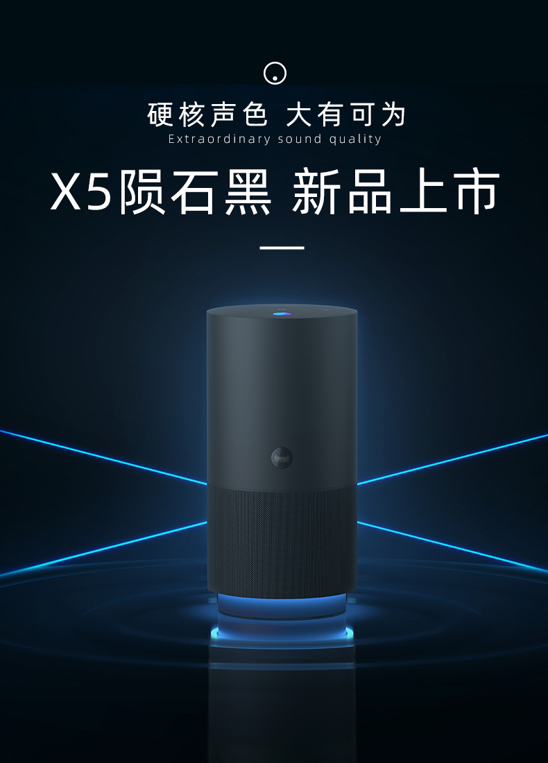 天猫精灵X5采用一体式定制圆编针织技术环保材料布网,爵士银、极昼蓝双色;具备环形悬浮律动灯,256级柔顺调光可根据音乐风格变换颜色氛围。
