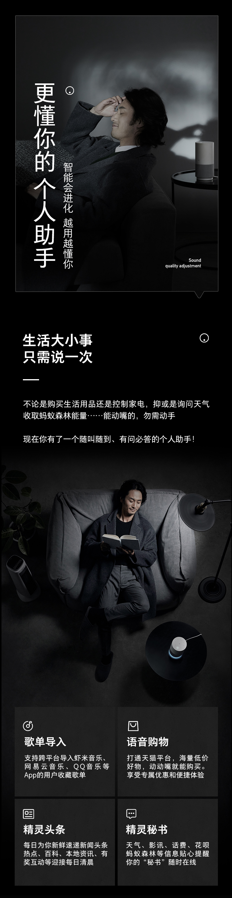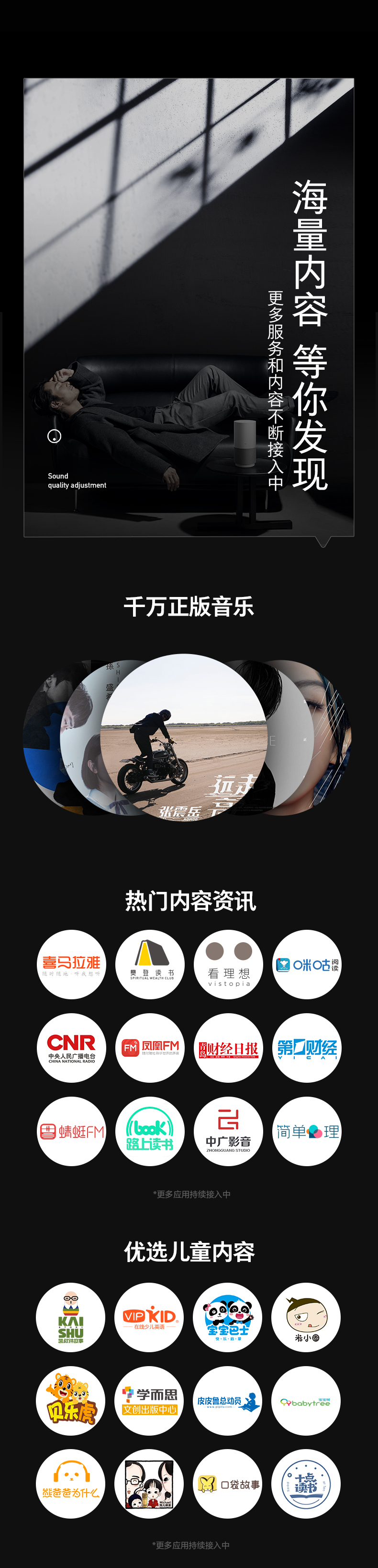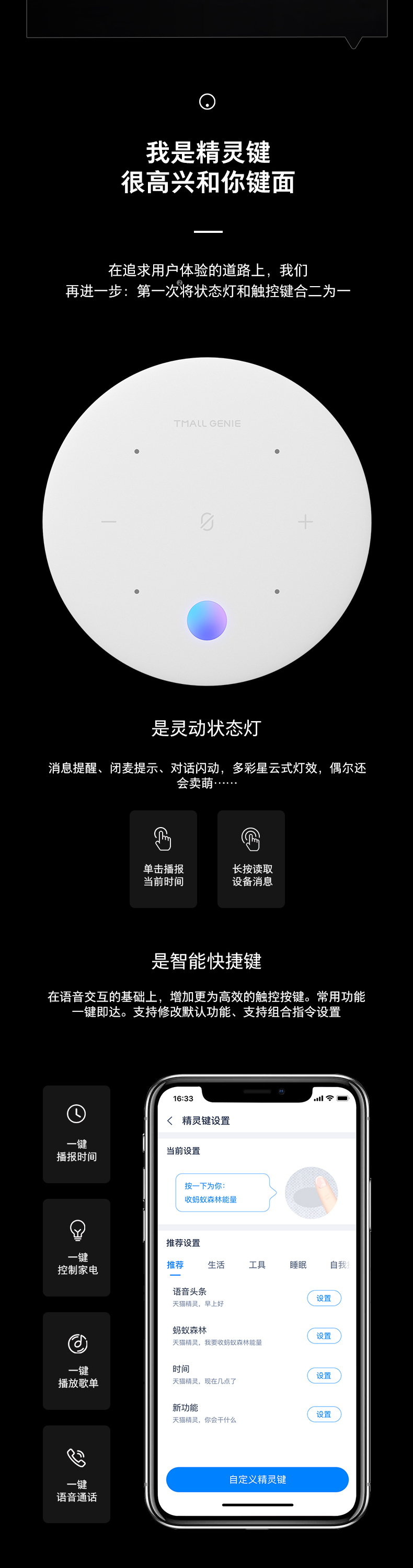 顶部增加状态灯和触控键二合一的精灵键,支持自定义一键快捷功能。智能家居方面可连接1100+品牌、80+品类、4900+型号设备,接入喜马拉雅、樊登读书、CNR、凤凰FM等海量内容和优选儿童内容。