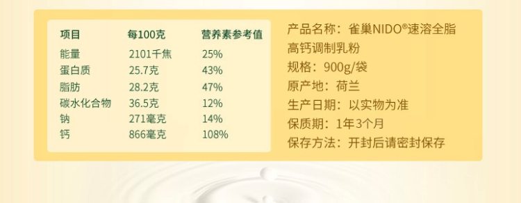 荷兰进口 世界知名品牌。雀巢全脂高钙奶粉,奶源来自全球公认好奶牛,荷兰荷斯坦奶牛,喂食营养的黑麦草,助产高蛋白和高钙的好奶。这款奶粉每100g含蛋白质高达25.7g、钙含量高达866mg,成人每日2杯就可满足钙的推荐摄入量的56%和营养所需。全脂相比脱脂,营养更丰富,不会因为脱脂产生流失,口味更加香醇。