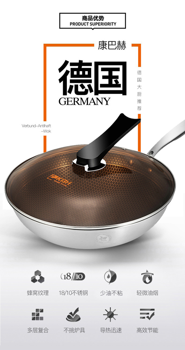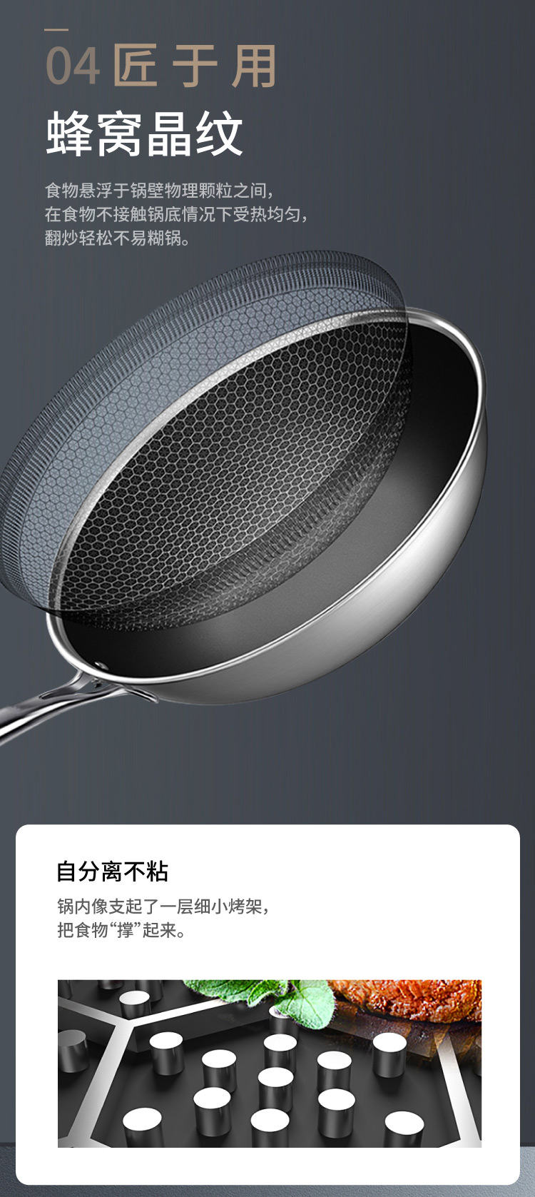 这款康巴赫不粘锅,采用了比C级老款半屏更高的E级全面不粘技术,实现锅内的全方位防粘。锅身是包括食品级304不锈钢在内的,共五层冲压,一体成型设计,更为牢固耐用。其中,锅内的蚀刻不粘工艺实现了蜂窝纹理全面覆盖,大幅度提高不粘特性,且少油烟,锅底不易发黄、不怕剐蹭,一擦即净,方便清理。