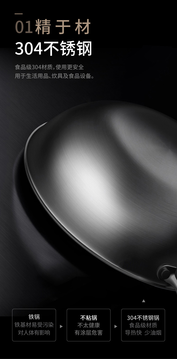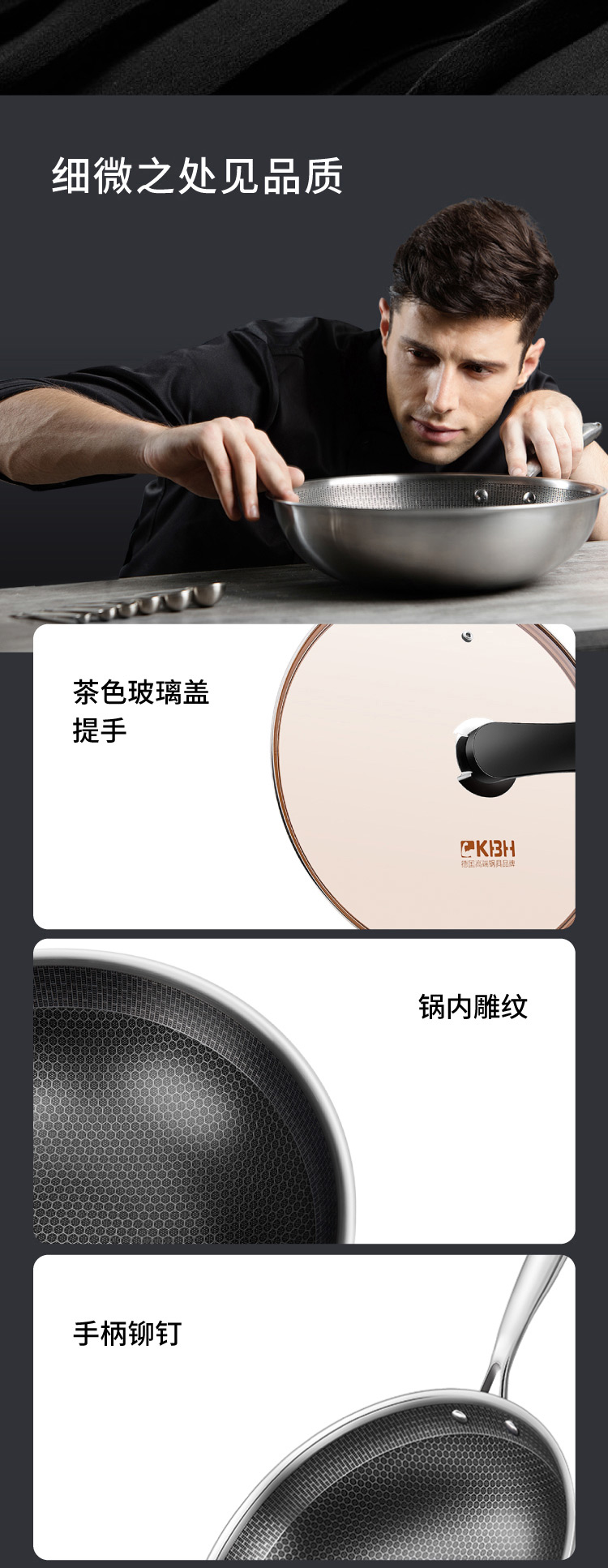 五层冲压一体成型的锅底,升温迅速且均匀,不挑炉灶,燃气灶、电磁炉等都适用。8.5cm锅深设计,平时做饭的煎炒蒸煮都能实现。把手与锅身为加固铆钉,内里的固定处光滑设计,不易藏污纳垢,冲洗迅速,也保证坚固耐用。