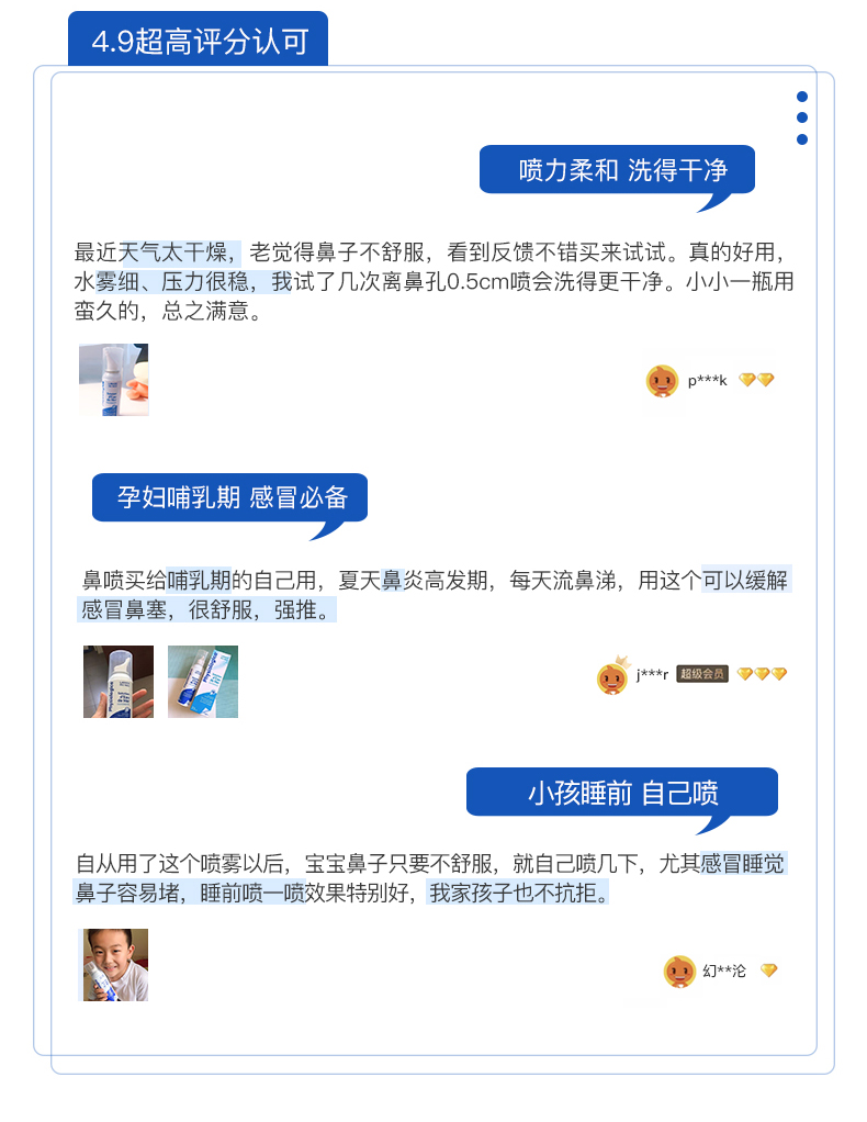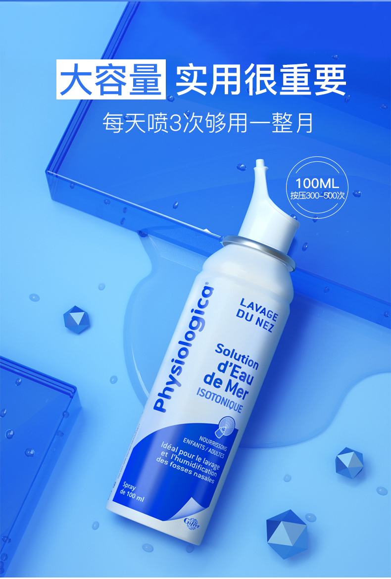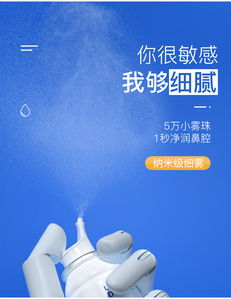 采用法国天使湾深海900m纯净海盐水提炼而成,0污染0细菌,富含多种有益元素,有利于修复鼻粘膜;经过16工序,层层过滤杀菌,达到医用级别的无菌纯净水,可缓解鼻干燥、鼻出血、鼻塞、鼻痒、流涕等鼻腔不适症状,对于鼻炎患者,有很好的效果,适合3岁以上的儿童和成人使用。