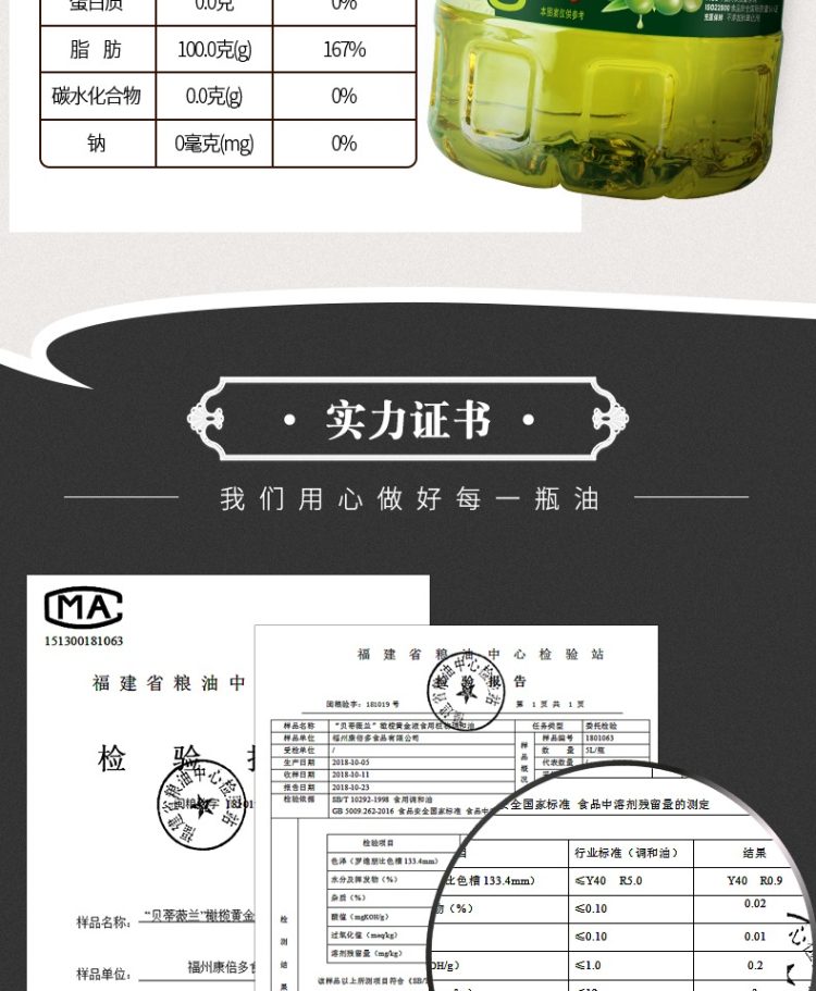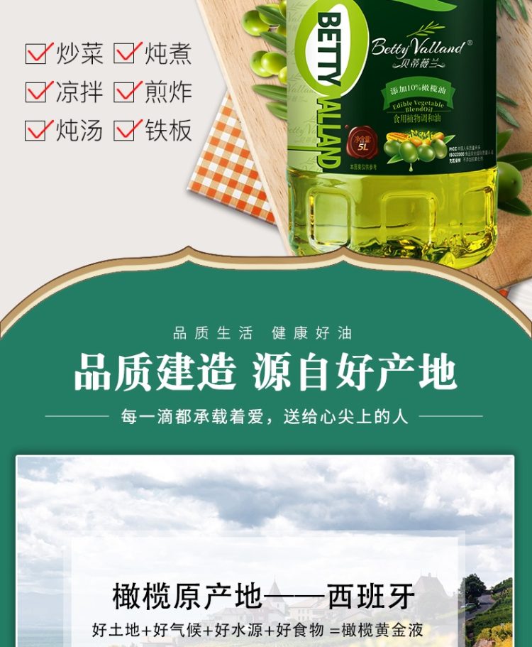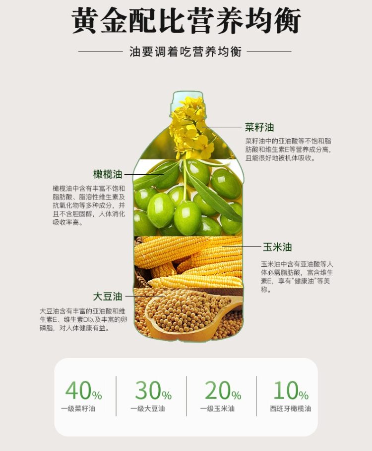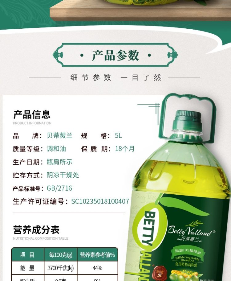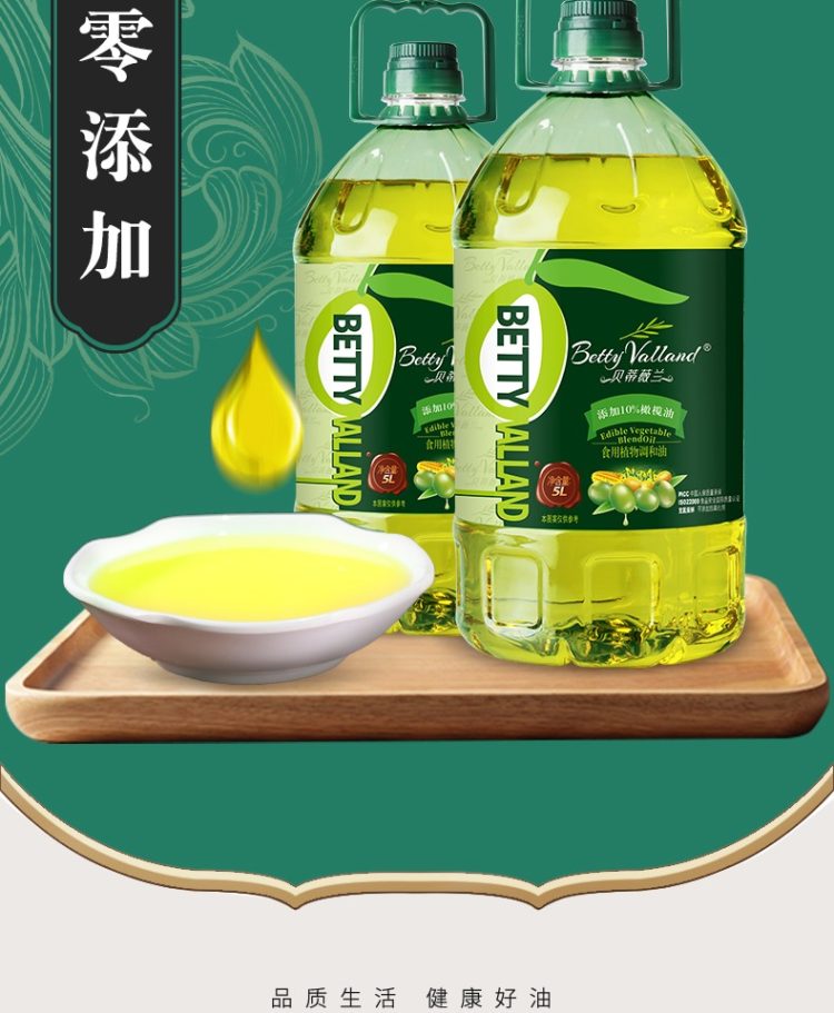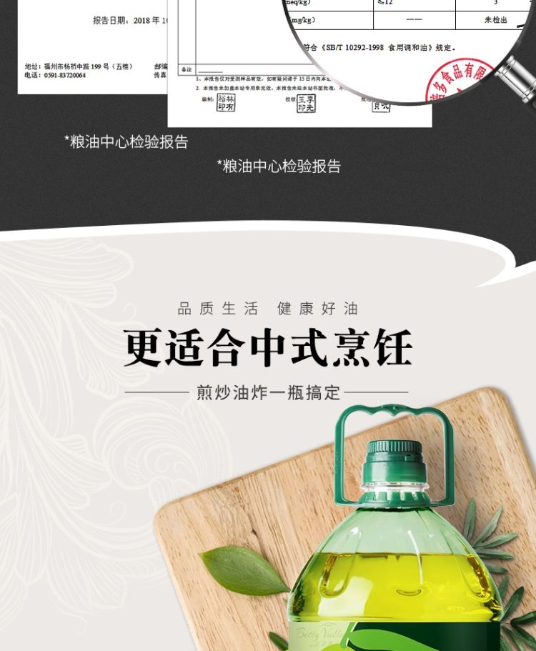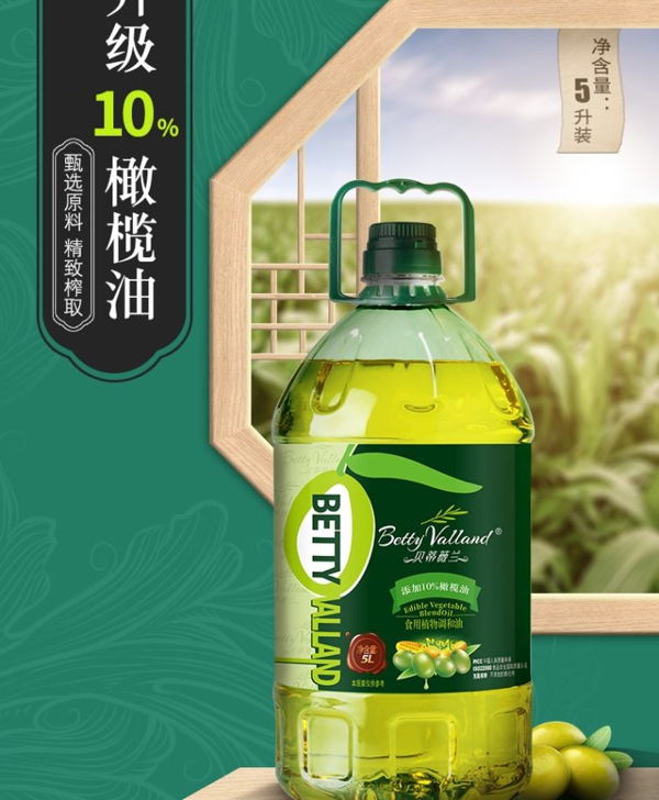 升级10%橄榄油,品牌直营,8月鲜油。商超热卖98元。升级10%橄榄油,不添加防腐剂,非转基因原料,早教协会推荐款,规格5L桶装,口感清淡不油腻,适合中式烹饪,每一滴油都让你吃的放心