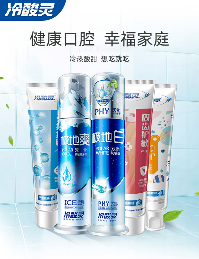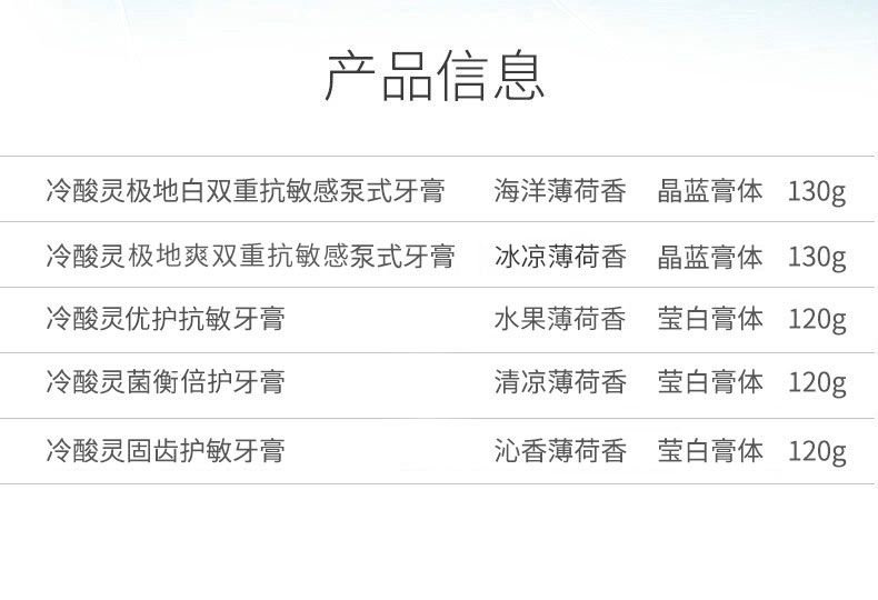 包含:冷酸灵极地爽双重抗敏感泵式牙膏 130g、冷酸灵极地白双重抗敏感 130g、冷酸灵固齿护敏牙膏 120g、冷酸灵优护抗敏牙膏 120g、冷酸灵菌衡护敏牙膏 120g。